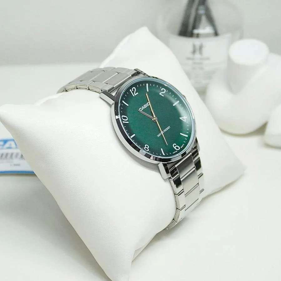 Мужские кварцевые часы Casio Collection — это универсальный аксессуар на каждый день. Корпус размером 46 мм и толщиной 8,2 мм выполнен из нержавеющей стали. Циферблат зелёного цвета оформлен штрихами, арабскими цифрами и стрелками. Циферблат защищён минеральным стекломМинеральное стеклоМинеральное стекло представляет собой искусственно выращенный минерал кварца. Такое стекло отличается особой устойчивостью к повреждениям и царапинам. Уступает по некоторым качествам сапфировому стеклу.. Часы оснащены стальным браслетом из нержавеющей стали на раскладной застёжкеРаскладная застёжкаТакой тип застёжки используется только на браслетах из металла. Она никогда не раскрывается полностью, происходит разделение на 2 и более частей. Раскладывающая застёжка снизит вероятность потери часов к минимуму.. Водонепроницаемость 30 м позволяет использовать часы в повседневных условиях. Идеальный выбор для тех, кто ценит японское качество и универсальный дизайн.