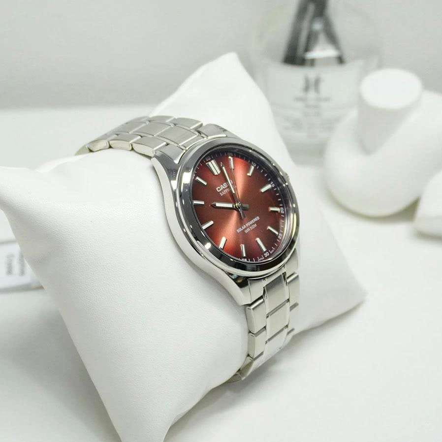 Мужские кварцевые часы Casio Collection — это современный и практичный аксессуар с питанием от солнечной энергии. Корпус размером 41,7 мм и толщиной 9,5 мм выполнен из нержавеющей стали. Циферблат красного цвета оформлен штрихами и стрелками. Циферблат защищён сапфировым стекломСапфировое стеклоПрочный и надёжный материал из кристалла сапфира синтетического происхождения, характеризующийся особой твёрдостью и устойчивостью к царапинам и повреждениям. с антибликовым покрытиемАнтибликовое покрытиеСлой оксида металла в 0,13-0,3 микрон, благодаря которому стекло часов не бликует и не отражает свет. Антибликовое покрытие уменьшает отражение света в 10 раз, обеспечивая отличную читаемость показателей циферблата.. Механизм — японский кварцевый калибр Miyota с центральной секундной стрелкой. Часы оснащены стальным браслетом из нержавеющей стали на раскладной застёжкеРаскладная застёжкаТакой тип застёжки используется только на браслетах из металла. Она никогда не раскрывается полностью, происходит разделение на 2 и более частей. Раскладывающая застёжка снизит вероятность потери часов к минимуму.. Заводная головка с защитой повышает надёжность. Водонепроницаемость 50 м позволяет использовать часы при мытье рук или в дождь. Идеальный выбор для тех, кто ценит японское качество и универсальный дизайн.