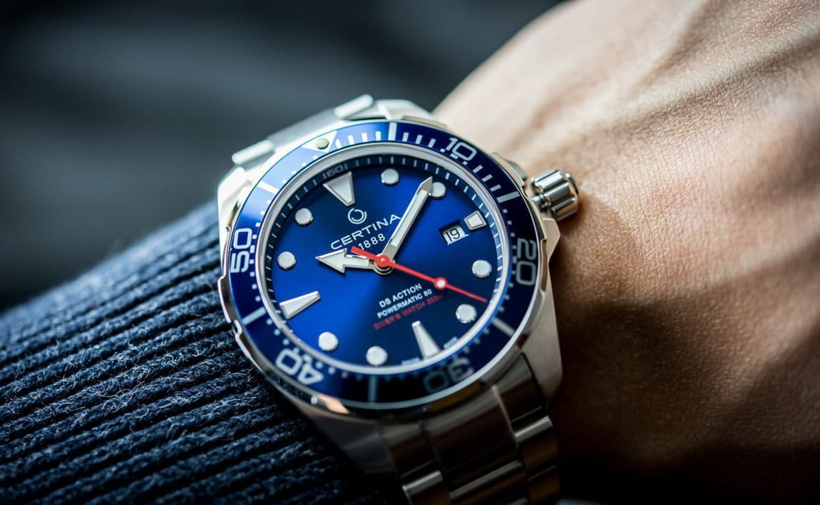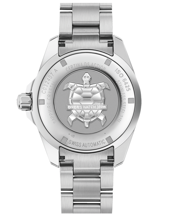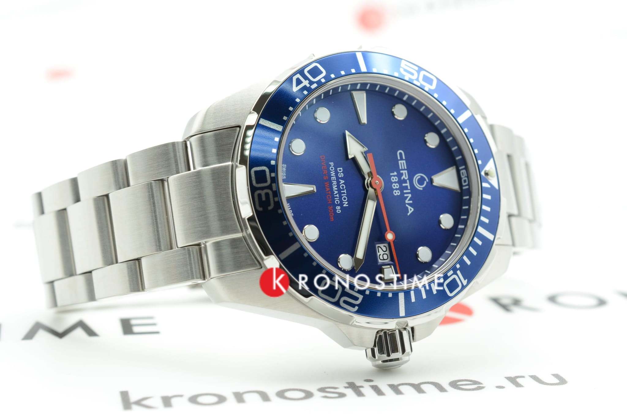 Серебристый аксессуар с синим циферблатом подходит для создания яркого акцента для делового образа. Красная секундная стрелка и крупные метки обеспечивают превосходную читаемость показаний времени. Автоподзавод. Швейцарский калибр ETA Powermatic 80Powermatic 80Эксклюзивный калибр от швейцарской компании ETA с увеличенным запасом хода до 80 часов за счёт удлинённой заводной пружины. Характеризуется улучшенной системой спуска со сниженным трением. с 80-часовым запасом хода. Реализация системы DS ConceptDS ConceptDouble Security Concept, обозначает двойную надёжность и безупречную точность часов Certina. Двойная система защиты подразумевает обеспечение максимальной устойчивости к ударам и высоких показателей водонепроницаемости.. Сапфировое стекло. Вращающийся безельБезельВнешний ободок, закрепляющий стекло. В спортивных часах так называется поворотное кольцо с делениями на циферблате, выполняет роль таймера – замеряет отрезки времени на шкале. Неподвижный безель – элемент декора. Однонаправленно вращающийся безель на дайверских часах позволяет фиксировать моменты погружения и выныривания на поверхность. из лёгкого алюминия. Водонепроницаемость 300 метров. Люминесцентная подсветкаЛюминесцентное покрытиеПозволяет считывать показания времени в темноте. Производители наносят на стрелки, часовые индексы, безель или поверхность циферблата светонакопительный состав, дающий холодное свечение.. Корпус и браслет из нержавеющей стали 316L. Застёжка с фиксатором и удлинением для дайверовУдлинение для дайверовЗастёжка с удлинением для дайверов представляет собой безопасное крепление, которое позволяет надевать часы поверх гидрокостюма. Гибкая застёжка удлиняется на 1-2 миллиметра.. Апертура даты. Диаметр корпуса: 43 мм.