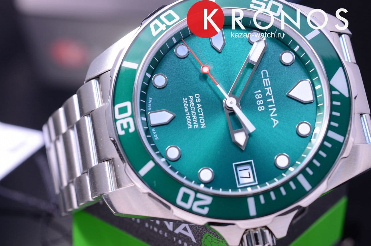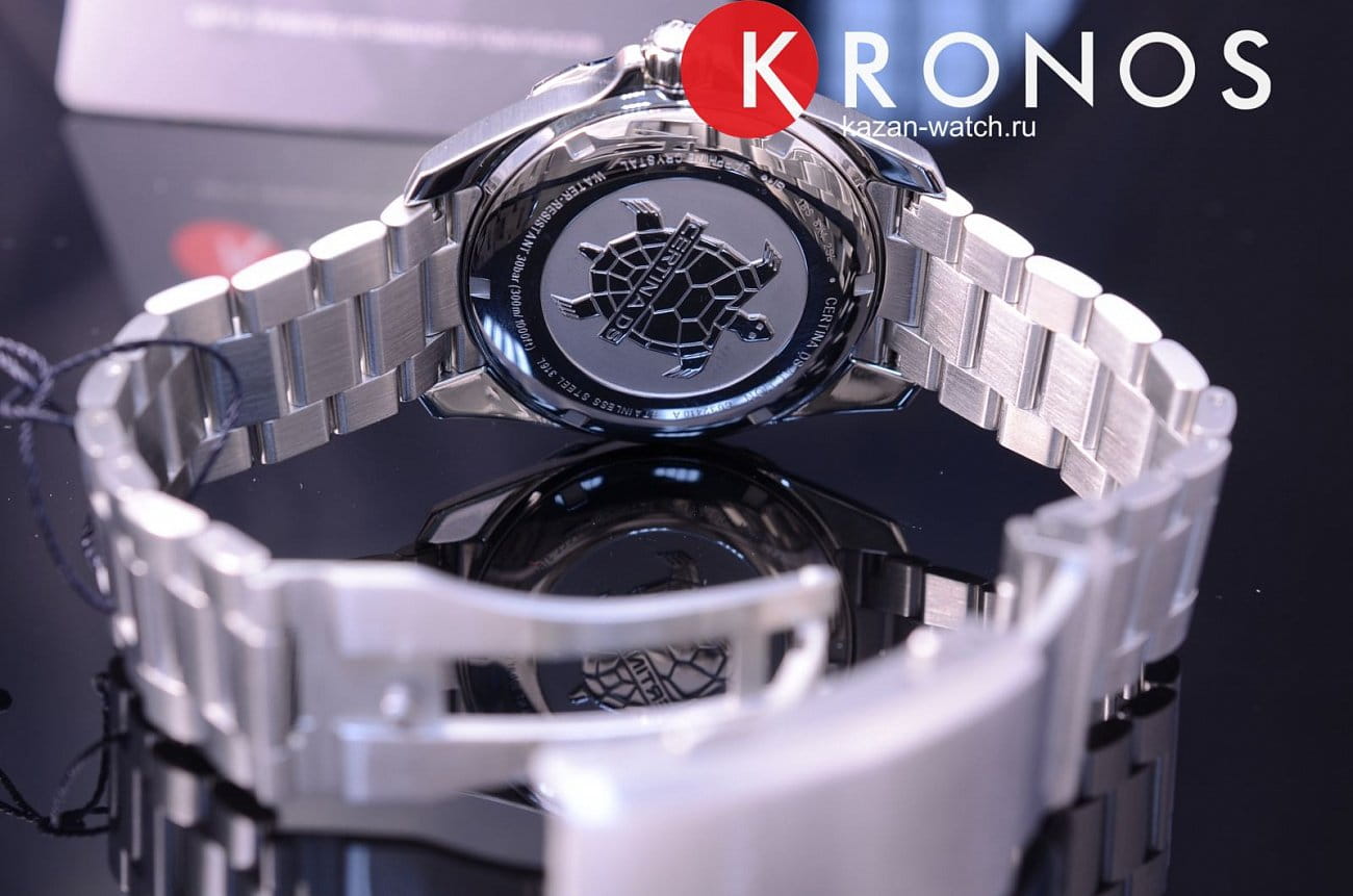 Часы отражают концепцию долговечности и практичности, использование инновационных материалов и высокоточного швейцарского калибра ETA F07.411 Precidrive™Precidrive™Инновационный кварцевый механизм Certina. Часы, оснащённые этим швейцарским калибром, приравниваются к точности к сертифицированным хронометрам, точность хода составляет +/-10 секунд в год. позволяет часам стильно выглядеть и сохранять безупречную работоспособность. Ударопрочный корпусУдаропрочный корпусМеханизм заключён в корпус, выполненный из современных материалов, устойчивых к ударам, механическим повреждениям и падению с высоты: инновационный пластик, карбон, нержавеющая сталь, титан. и браслет из стали, устойчивой к царапинам и повреждениям. Сапфировое стекло. Система Double SecurityDS ConceptDouble Security Concept, обозначает двойную надёжность и безупречную точность часов Certina. Двойная система защиты подразумевает обеспечение максимальной устойчивости к ударам и высоких показателей водонепроницаемости.. Вращающийся безельБезельВнешний ободок, закрепляющий стекло. В спортивных часах так называется поворотное кольцо с делениями на циферблате, выполняет роль таймера – замеряет отрезки времени на шкале. Неподвижный безель – элемент декора. Однонаправленно вращающийся безель на дайверских часах позволяет фиксировать моменты погружения и выныривания на поверхность.. Водонепроницаемость WR 300. Апертура даты, функция EOLEOLПредставляет собой систему, уведомляющую владельца часов о необходимости замены элемента питания. За 2 недели до полного разряда батарейки секундная стрелка перестаёт ходить чётко и начинает перепрыгивать на 3-4 деления.. «Умная» застёжка с удлинением для дайверовУдлинение для дайверовЗастёжка с удлинением для дайверов представляет собой безопасное крепление, которое позволяет надевать часы поверх гидрокостюма. Гибкая застёжка удлиняется на 1-2 миллиметра.. Диаметр корпуса: 41 мм.