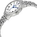 Женская модель, индикация часов, минут, секунд центральными стрелками. Окошко даты в положении 6 часов. Циферблат выполнен в белом цвете.