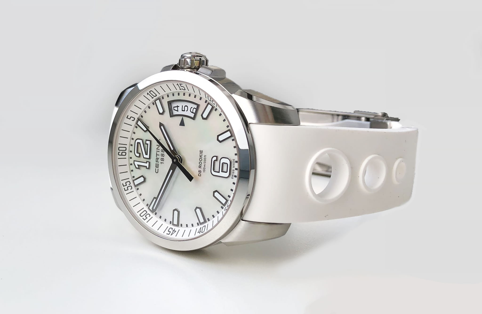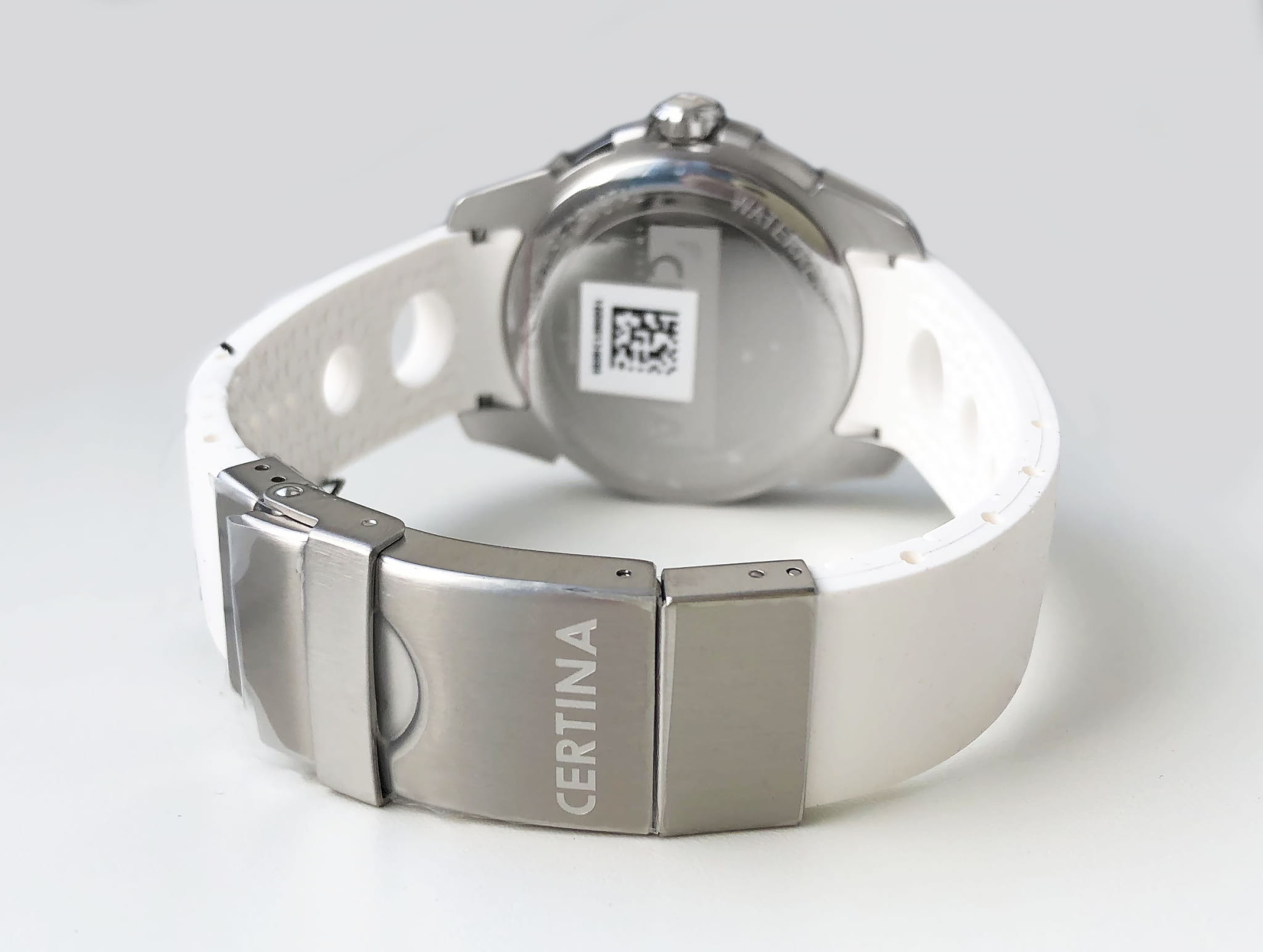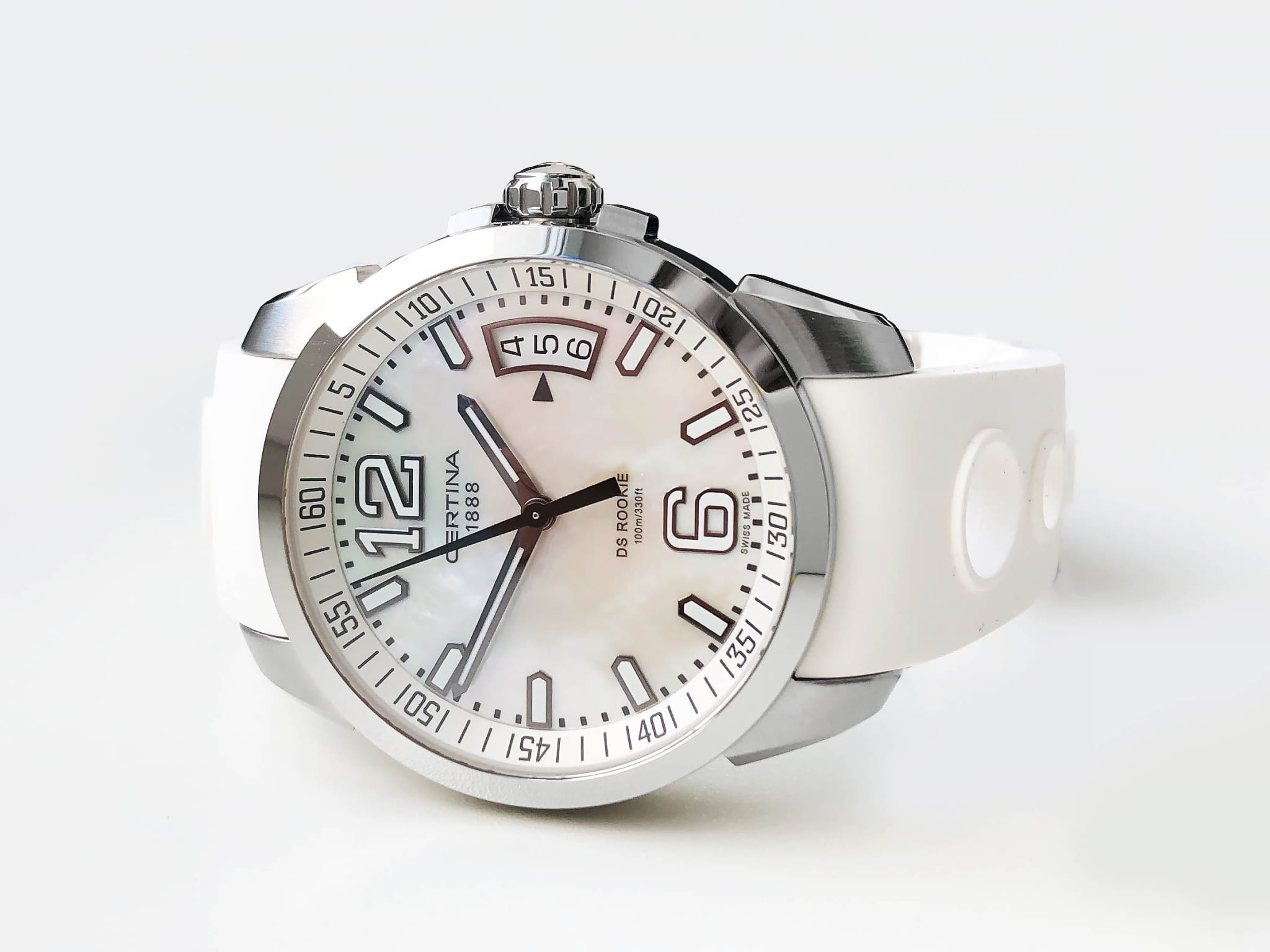 Крупные контрастные элементы, расположенные на белом циферблате, обеспечивают идеальную читаемость данных вне зависимости от условий видимости. Часы комплектуются швейцарским кварцевым механизмом ETA F07.111, демонстрирующим безупречную точность хода. Система Двойной Надёжности DS ConceptDS ConceptDouble Security Concept, обозначает двойную надёжность и безупречную точность часов Certina. Двойная система защиты подразумевает обеспечение максимальной устойчивости к ударам и высоких показателей водонепроницаемости.. Ударопрочный корпусУдаропрочный корпусМеханизм заключён в корпус, выполненный из современных материалов, устойчивых к ударам, механическим повреждениям и падению с высоты: инновационный пластик, карбон, нержавеющая сталь, титан. и браслет из хирургической стали 316L, устойчивой к коррозии. Люминесцентная подсветкаЛюминесцентное покрытиеПозволяет считывать показания времени в темноте. Производители наносят на стрелки, часовые индексы, безель или поверхность циферблата светонакопительный состав, дающий холодное свечение.. Степень водостойкости WR 100. Застёжка бабочка с кнопкамиЗастёжка "бабочка"Такой вид застёжки дополняется предохранителями, помогающими избежать случайного раскрытия браслета. Обладают изящным исполнением.