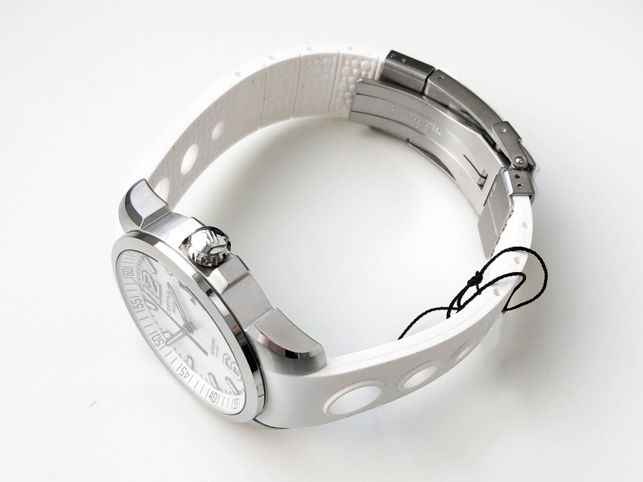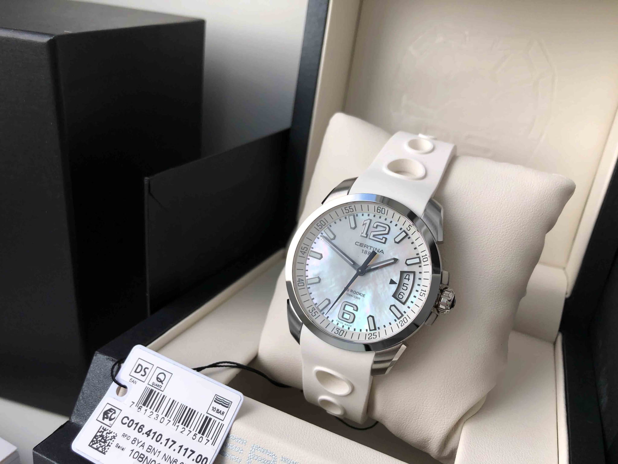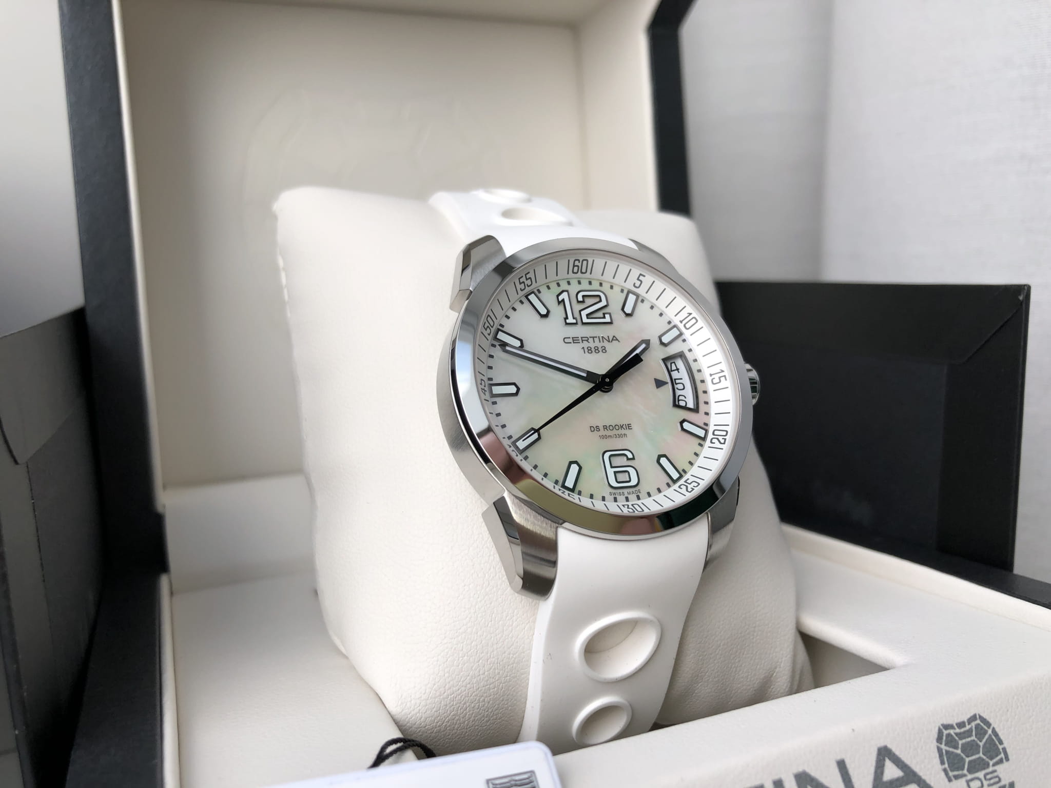 Крупные контрастные элементы, расположенные на белом циферблате, обеспечивают идеальную читаемость данных вне зависимости от условий видимости. Часы комплектуются швейцарским кварцевым механизмом ETA F07.111, демонстрирующим безупречную точность хода. Система Двойной Надёжности DS ConceptDS ConceptDouble Security Concept, обозначает двойную надёжность и безупречную точность часов Certina. Двойная система защиты подразумевает обеспечение максимальной устойчивости к ударам и высоких показателей водонепроницаемости.. Ударопрочный корпусУдаропрочный корпусМеханизм заключён в корпус, выполненный из современных материалов, устойчивых к ударам, механическим повреждениям и падению с высоты: инновационный пластик, карбон, нержавеющая сталь, титан. и браслет из хирургической стали 316L, устойчивой к коррозии. Люминесцентная подсветкаЛюминесцентное покрытиеПозволяет считывать показания времени в темноте. Производители наносят на стрелки, часовые индексы, безель или поверхность циферблата светонакопительный состав, дающий холодное свечение.. Степень водостойкости WR 100. Застёжка бабочка с кнопкамиЗастёжка "бабочка"Такой вид застёжки дополняется предохранителями, помогающими избежать случайного раскрытия браслета. Обладают изящным исполнением.