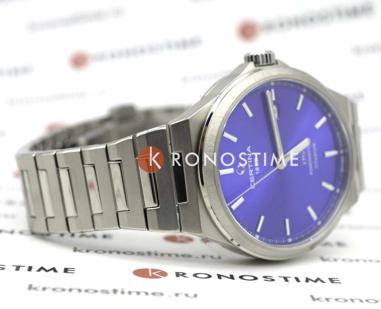 Certina DS-7 Powermatic Titanium 80 C043.407.44.041.00 – мужские часы для поклонников ярких аксессуаров. И корпус, и браслет изготовлены из высококачественной титанового сплава. Под твердым сапфировым стекломСапфировое стеклоПрочный и надёжный материал из кристалла сапфира синтетического происхождения, характеризующийся особой твёрдостью и устойчивостью к царапинам и повреждениям. с антибликовым покрытиемАнтибликовое покрытиеСлой оксида металла в 0,13-0,3 микрон, благодаря которому стекло часов не бликует и не отражает свет. Антибликовое покрытие уменьшает отражение света в 10 раз, обеспечивая отличную читаемость показателей циферблата. находится синий циферблат и на котором вы найдете окошко даты в положении 3 часа, а также маркировку, покрытую люминесцентным покрытиемЛюминесцентное покрытиеПозволяет считывать показания времени в темноте. Производители наносят на стрелки, часовые индексы, безель или поверхность циферблата светонакопительный состав, дающий холодное свечение. Super-LumiNova. Все это приводится в действие автоматическим механизмом Powermatic 80Powermatic 80Эксклюзивный калибр от швейцарской компании ETA с увеличенным запасом хода до 80 часов за счёт удлинённой заводной пружины. Характеризуется улучшенной системой спуска со сниженным трением..611 с пружиной Nivachron™Nivachron™Специально разработанный инновационный сплав Nivachron™ повышает устойчивость часов к воздействию магнитных полей.. Класс водозащиты: 100 метров, позволит плавать, нырять и заниматься другими водными видами спорта. Титановый браслет с на застёжке-бабочке с кнопкамиЗастёжка "бабочка"Такой вид застёжки дополняется предохранителями, помогающими избежать случайного раскрытия браслета. Обладают изящным исполнением. .