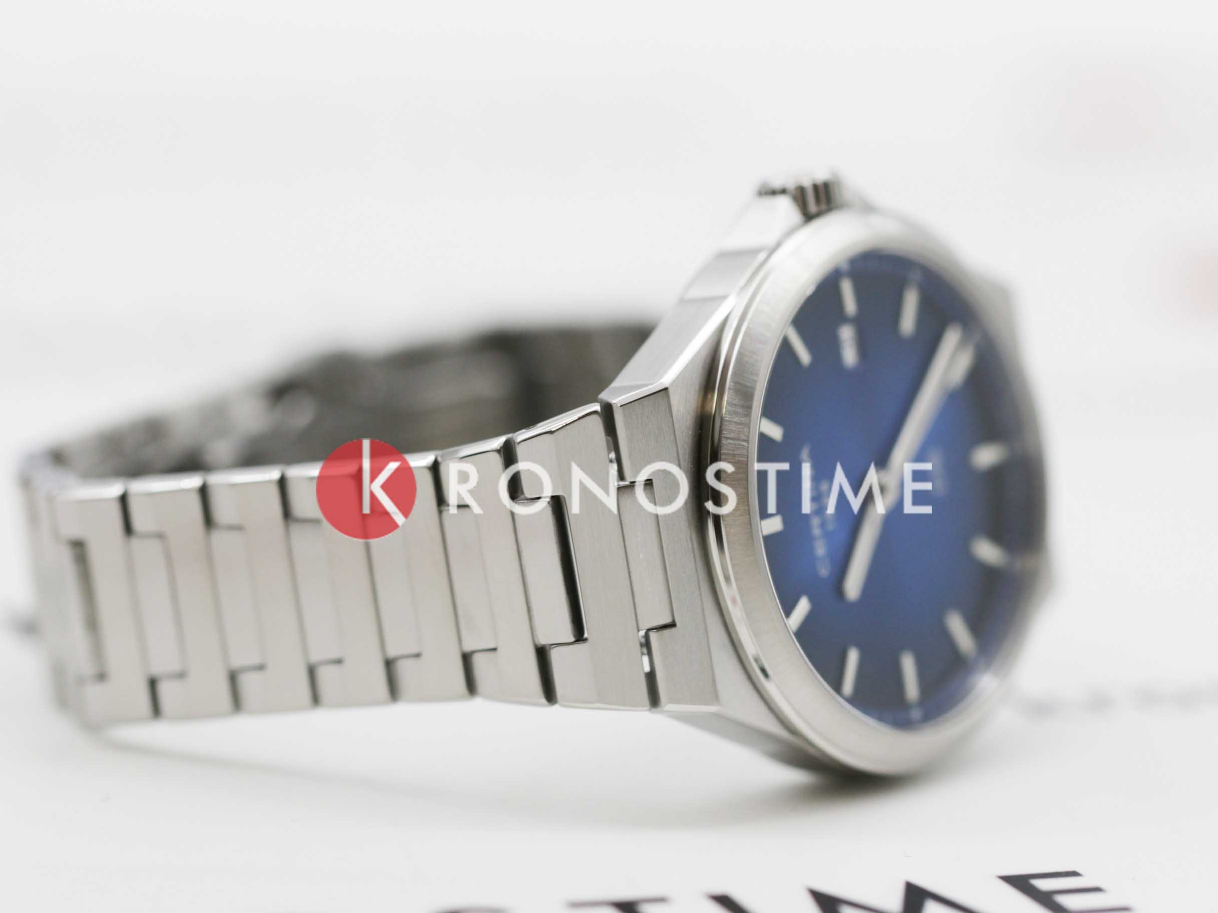 Глубокий синий циферблат дополнен люминесцентными стрелками и метками с покрытием Super-LumiNova®, что гарантирует видимость даже в условиях слабого освещения. Окошко даты расположено на отметке «3 часа», добавляя практичности модели.