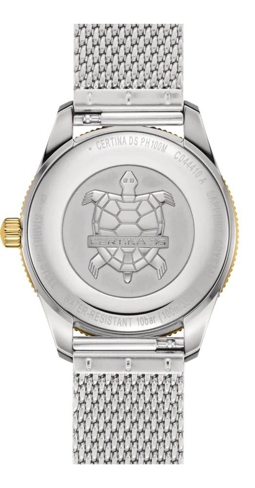 Certina DS PH100M Gent C044.410.21.030.00– часы для поклонников ярких аксессуаров. Корпус изготовлен из высококачественной нержавеющей стали 316L с . Под твердым сапфировым стекломСапфировое стеклоПрочный и надёжный материал из кристалла сапфира синтетического происхождения, характеризующийся особой твёрдостью и устойчивостью к царапинам и повреждениям. с антибликовым покрытиемАнтибликовое покрытиеСлой оксида металла в 0,13-0,3 микрон, благодаря которому стекло часов не бликует и не отражает свет. Антибликовое покрытие уменьшает отражение света в 10 раз, обеспечивая отличную читаемость показателей циферблата. находится бежевый циферблат на котором вы найдете окошко даты в положении 3 часа, а также маркировку, покрытую люминесцентным покрытиемЛюминесцентное покрытиеПозволяет считывать показания времени в темноте. Производители наносят на стрелки, часовые индексы, безель или поверхность циферблата светонакопительный состав, дающий холодное свечение. Super-LumiNova. Класс водозащиты: 100 метров, позволит плавать, нырять и заниматься другими водными видами спорта. Стальной ремешок миланского плетения на застёжке-бабочке с кнопкамиЗастёжка "бабочка"Такой вид застёжки дополняется предохранителями, помогающими избежать случайного раскрытия браслета. Обладают изящным исполнением. . БезельБезельВнешний ободок, закрепляющий стекло. В спортивных часах так называется поворотное кольцо с делениями на циферблате, выполняет роль таймера – замеряет отрезки времени на шкале. Неподвижный безель – элемент декора. Однонаправленно вращающийся безель на дайверских часах позволяет фиксировать моменты погружения и выныривания на поверхность. из нержавеющей стали с PVD-покрытиемPVDУльтратонкое покрытие наносится в технике вакуумного напыления, сочетает в себе нитрид титана особой прочности со слоем золота или оксида хрома. Несёт в себе декоративную или защитную функцию.