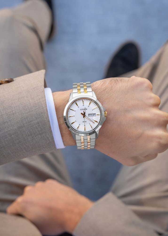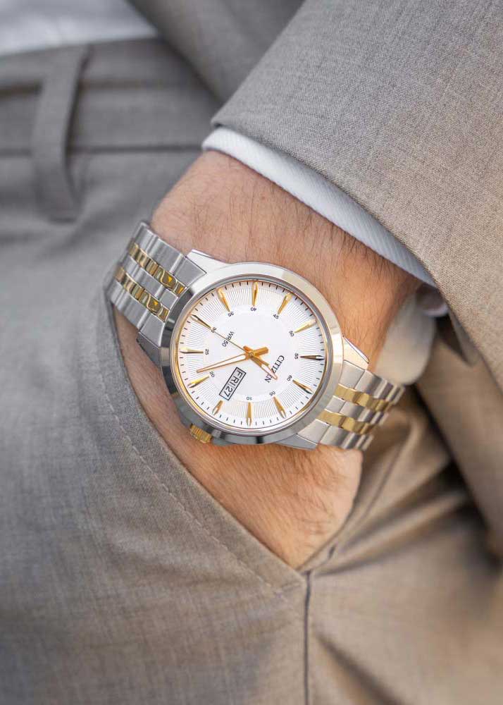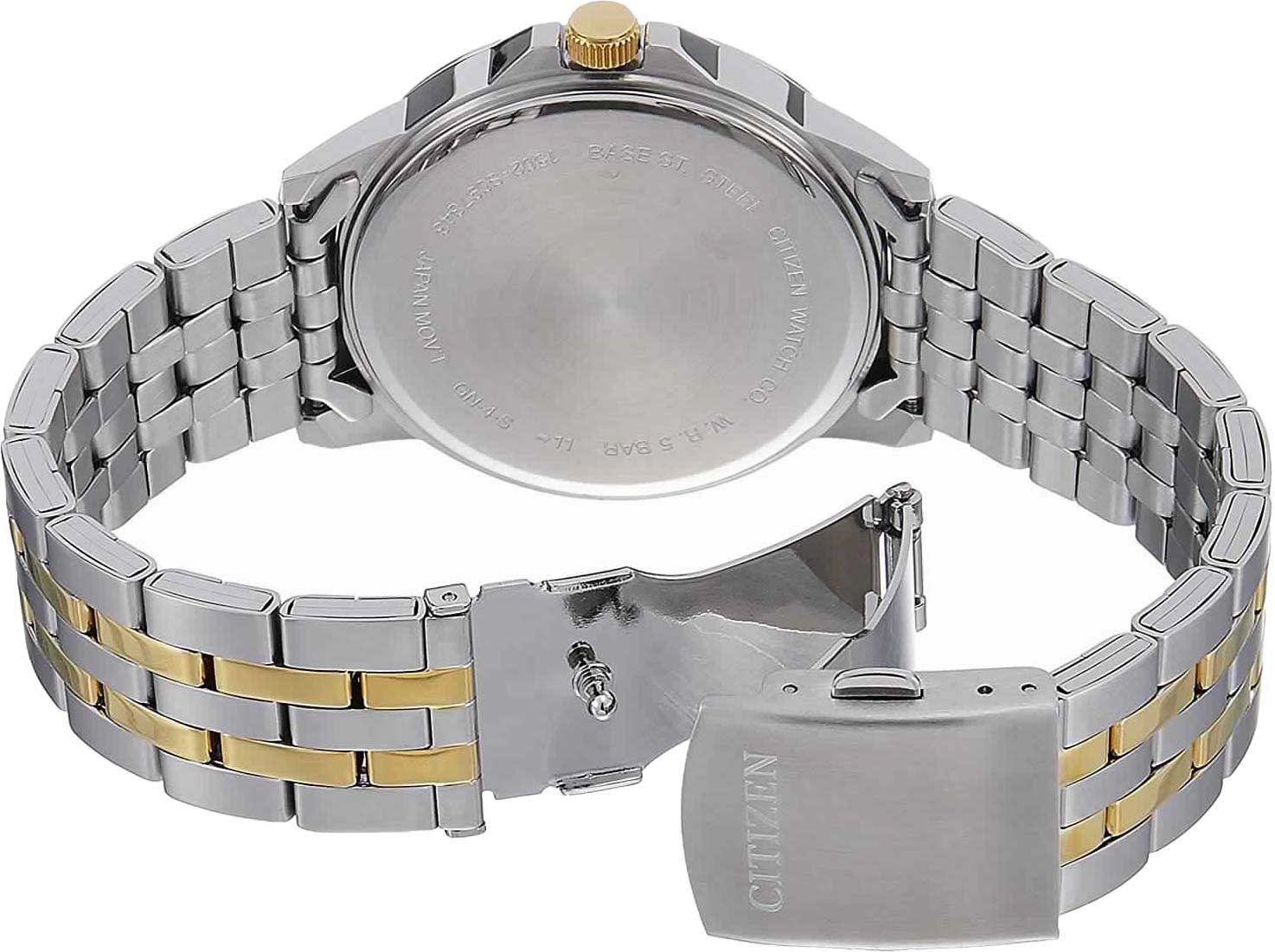 Часы Citizen Basic BF2018-52A— это элегантная модель от известного японского бренда, сочетающая надежность и современный стиль. Кварцевый механизм Citizen 1502 обеспечивает точный ход, а стальной корпус диаметром 41 мм гарантирует долговечность и привлекательный внешний вид. Циферблат украшен лаконичными метками в виде штрихов. Окошко даты находится в положении 3 часа. Стрелки и метки с люминесцентным покрытиемЛюминесцентное покрытиеПозволяет считывать показания времени в темноте. Производители наносят на стрелки, часовые индексы, безель или поверхность циферблата светонакопительный состав, дающий холодное свечение. позволяют легко считывать время даже в условиях недостаточного освещения. Стальной браслет с частичным IP-покрытиемIP-покрытиеМетод ионного напыления. Демонстрирует повышенную устойчивость к истиранию, окислению и химическим веществам. Под воздействием высокого давления и температуры около 1500°C молекулы металла надёжно соединяются с частицами корпуса часов. на раскладной застёжкеРаскладная застёжкаТакой тип застёжки используется только на браслетах из металла. Она никогда не раскрывается полностью, происходит разделение на 2 и более частей. Раскладывающая застёжка снизит вероятность потери часов к минимуму. надежно фиксирует часы на запястье, обеспечивая комфорт при ежедневном ношении. Минеральное стеклоМинеральное стеклоМинеральное стекло представляет собой искусственно выращенный минерал кварца. Такое стекло отличается особой устойчивостью к повреждениям и царапинам. Уступает по некоторым качествам сапфировому стеклу. защищает циферблат от царапин и повреждений, а водозащита 50 метров позволит защитить корпус от случайных брызг или капель дождя.