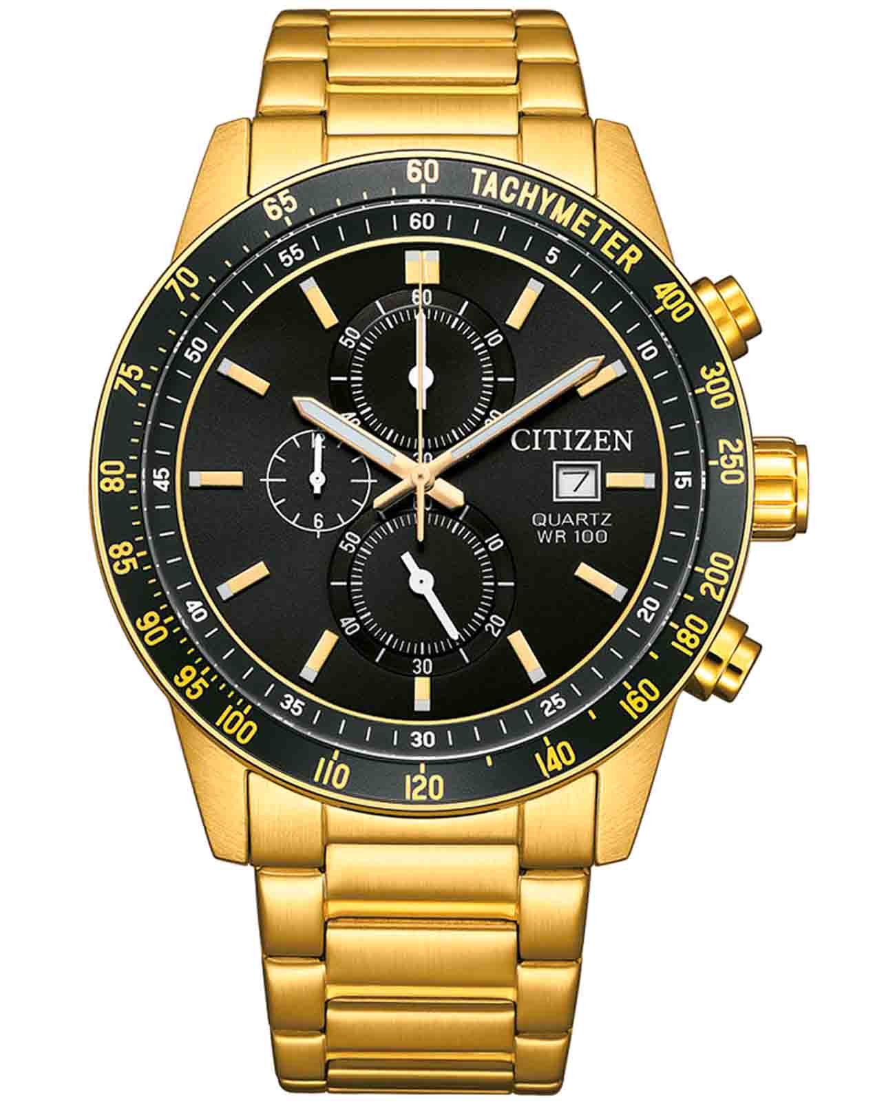 Citizen Chronograph AN3682-54E часы-хронографХронографФункция позволяет измерять отрезки времени с особой точностью: часы, минуты, секунды. Верным признаком хронографа является наличие на циферблате 3 дополнительных окошек-счётчиков. с секундомеромСекундомерСекундоме́р — прибор, способный измерять интервалы времени с точностью до долей секунды. спортивного дизайна с высоким уровнем водозащиты. Корпус из нержавеющей стали с IP-покрытиемIP-покрытиеМетод ионного напыления. Демонстрирует повышенную устойчивость к истиранию, окислению и химическим веществам. Под воздействием высокого давления и температуры около 1500°C молекулы металла надёжно соединяются с частицами корпуса часов. диаметром 44 мм идеально сбалансирован. Минеральное стеклоМинеральное стеклоМинеральное стекло представляет собой искусственно выращенный минерал кварца. Такое стекло отличается особой устойчивостью к повреждениям и царапинам. Уступает по некоторым качествам сапфировому стеклу. обеспечивает отличную защиту циферблата от царапин. Часы работают на основе кварцевого механизма. Стальной браслет на раскладной застёжкеРаскладная застёжкаТакой тип застёжки используется только на браслетах из металла. Она никогда не раскрывается полностью, происходит разделение на 2 и более частей. Раскладывающая застёжка снизит вероятность потери часов к минимуму. идеально дополняют дизайн часов, обеспечивая комфортное ношение. Стрелки и метки на циферблате имеют люминесцентное покрытиеЛюминесцентное покрытиеПозволяет считывать показания времени в темноте. Производители наносят на стрелки, часовые индексы, безель или поверхность циферблата светонакопительный состав, дающий холодное свечение. позволяющее легко определять время даже в темноте. БезельБезельВнешний ободок, закрепляющий стекло. В спортивных часах так называется поворотное кольцо с делениями на циферблате, выполняет роль таймера – замеряет отрезки времени на шкале. Неподвижный безель – элемент декора. Однонаправленно вращающийся безель на дайверских часах позволяет фиксировать моменты погружения и выныривания на поверхность. с IP-покрытиемIP-покрытиеМетод ионного напыления. Демонстрирует повышенную устойчивость к истиранию, окислению и химическим веществам. Под воздействием высокого давления и температуры около 1500°C молекулы металла надёжно соединяются с частицами корпуса часов. и шкалой тахиметраТахиметрРазмеченная шкала, располагается на ободке или безеле часов. Тахиметр позволяет рассчитать скорость на определённом участке пути, расстояние измеряется в километрах или милях.. Секундомер с точностью 1с и временем измерения 12ч отображается центральной стрелкой. Окошко даты находится в положении 3 часа. Часы обладают впечатляющей водонепроницаемостью до 100WR, что делает их идеальными для повседневной носки.