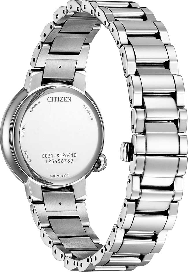 Часы Citizen EM0910-80D — воплощение изысканности и современных технологий, выполненное в Японии. Корпус и литой браслет изготовлены из прочной нержавеющей стали, что гарантирует долговечность и элегантный внешний вид. Перламутровый циферблат с завораживающими переливами украшен бриллиантом, а часовые метки выполнены в виде точек, что придаёт образу особую утонченность. Заводная головка с защитой находится в положении 8 часов и также украшена камнем. Защиту от царапин обеспечивает сапфировое стеклоСапфировое стеклоПрочный и надёжный материал из кристалла сапфира синтетического происхождения, характеризующийся особой твёрдостью и устойчивостью к царапинам и повреждениям., сохраняющее безупречный вид часов на длительное время. Модель оснащена инновационной системой Eco-Drive, работающей на солнечной энергии и не требующей замены батарейки, с запасом хода до 180 дней. Предусмотрена функция индикации уровня заряда (EOLEOLПредставляет собой систему, уведомляющую владельца часов о необходимости замены элемента питания. За 2 недели до полного разряда батарейки секундная стрелка перестаёт ходить чётко и начинает перепрыгивать на 3-4 деления.) и предотвращения перезарядки. Диаметр корпуса составляет 30 мм, толщина — 8,5 мм, вес — 74 г, что обеспечивает комфортное ношение в течение всего дня. Водозащита уровня 50WR позволяет не снимать часы при мытье рук или в дождливую погоду. Браслет с застежкой «бабочка»Застёжка "бабочка"Такой вид застёжки дополняется предохранителями, помогающими избежать случайного раскрытия браслета. Обладают изящным исполнением. обеспечивает дополнительный комфорт и безопасность при носке.  Эта модель станет не только стильным аксессуаром, но и символом безупречного вкуса и внимания к деталям.