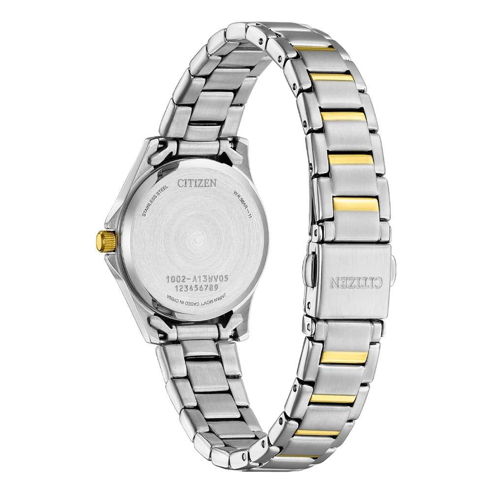 Часы Citizen EQ0614-52B — стильная модель для современных женщин, ценящих качество и элегантность. Корпус и браслет выполнены из прочной нержавеющей стали с изящным серебристым покрытием, а на безельБезельВнешний ободок, закрепляющий стекло. В спортивных часах так называется поворотное кольцо с делениями на циферблате, выполняет роль таймера – замеряет отрезки времени на шкале. Неподвижный безель – элемент декора. Однонаправленно вращающийся безель на дайверских часах позволяет фиксировать моменты погружения и выныривания на поверхность. и браслет (частично) нанесено золотистое IP-покрытиемIP-покрытиеМетод ионного напыления. Демонстрирует повышенную устойчивость к истиранию, окислению и химическим веществам. Под воздействием высокого давления и температуры около 1500°C молекулы металла надёжно соединяются с частицами корпуса часов., что придает аксессуару утончённый и универсальный внешний вид. Браслет оснащен раскладной застёжкойРаскладная застёжкаТакой тип застёжки используется только на браслетах из металла. Она никогда не раскрывается полностью, происходит разделение на 2 и более частей. Раскладывающая застёжка снизит вероятность потери часов к минимуму.. Серебристый циферблат украшен арабскими цифрами и серебристо-белыми стрелками с люминесцентным покрытиемЛюминесцентное покрытиеПозволяет считывать показания времени в темноте. Производители наносят на стрелки, часовые индексы, безель или поверхность циферблата светонакопительный состав, дающий холодное свечение., обеспечивая отличную читаемость времени, также он дополнен удобным календарем с окошком даты на позиции 3 часов. Модель оснащена надёжным кварцевым механизмом японского производства, отличается высокой точностью хода и минимальными требованиями к обслуживанию. Диаметр корпуса составляет 27.5 мм, толщина — всего 7 мм, что делает часы лёгкими и комфортными для ежедневного ношения. Минеральное стеклоМинеральное стеклоМинеральное стекло представляет собой искусственно выращенный минерал кварца. Такое стекло отличается особой устойчивостью к повреждениям и царапинам. Уступает по некоторым качествам сапфировому стеклу. защищает циферблат от случайных царапин, а водозащита уровня WR30 обеспечивает защиту от дождя и брызг.