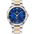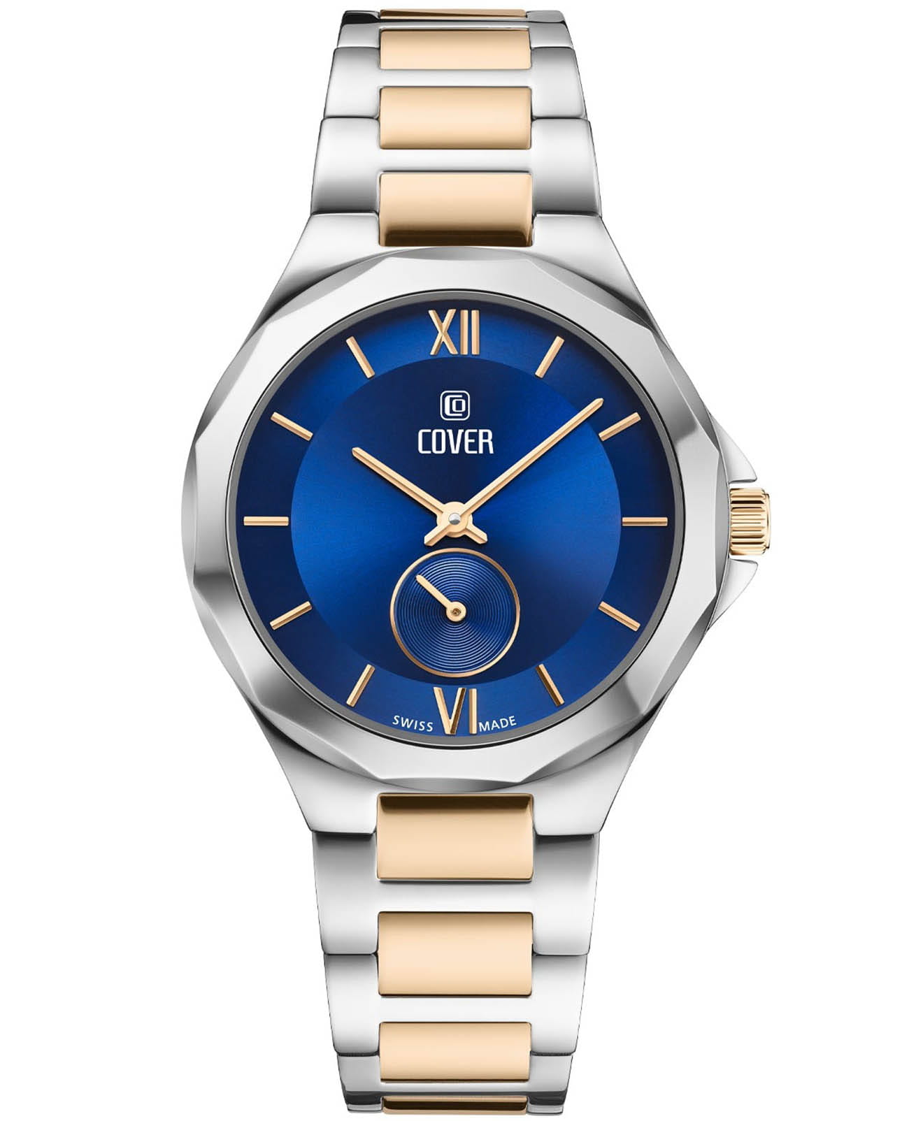 Женские швейцарские часы COVER CO211.03 — это изысканный повседневный аксессуар с оригинальным 12-угольным стальным корпусом из коллекции Cardea. Часы оснащены кварцевым калибром ETA 902.501. Синий циферблат с круговой сатинированной отделкой и узором Sunray придает им элегантный вид.  Надежное минеральное стеклоМинеральное стеклоМинеральное стекло представляет собой искусственно выращенный минерал кварца. Такое стекло отличается особой устойчивостью к повреждениям и царапинам. Уступает по некоторым качествам сапфировому стеклу. защищает часы от царапин и долго сохраняет первоначальный внешний вид. Накладные индексы и римские цифры VI и XII добавляют стильный акцент. Малая секундная стрелка расположена в положении «6 часов». Интегрированный браслет с PVDPVDУльтратонкое покрытие наносится в технике вакуумного напыления, сочетает в себе нитрид титана особой прочности со слоем золота или оксида хрома. Несёт в себе декоративную или защитную функцию. покрытием золотого цвета на раскладной застёжкеРаскладная застёжкаТакой тип застёжки используется только на браслетах из металла. Она никогда не раскрывается полностью, происходит разделение на 2 и более частей. Раскладывающая застёжка снизит вероятность потери часов к минимуму. обеспечивает комфорт и надежность. Часы имеют маркировку «Swiss Made», что подтверждает их высокое качество и точность.