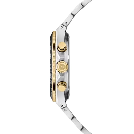 Мужские наручные часы-хронографХронографФункция позволяет измерять отрезки времени с особой точностью: часы, минуты, секунды. Верным признаком хронографа является наличие на циферблате 3 дополнительных окошек-счётчиков. Cover CO212.03 из коллекции Iconosteel сочетают в себе классический дизайн и надежность современных технологий. Модель обладает круглым корпусом диаметром 41 мм, изготовленным из нержавеющей стали с частичным PVD-покрытиемPVDУльтратонкое покрытие наносится в технике вакуумного напыления, сочетает в себе нитрид титана особой прочности со слоем золота или оксида хрома. Несёт в себе декоративную или защитную функцию., что обеспечивает высокую устойчивость к внешним воздействиям. Браслет выполнен из нержавеющей стали с раскладной застежкойРаскладной замокДанный вариант застежки используется только на часах с металлическим браслетом. Отличительная особенность такого крепления в том, что длина браслета становится универсальной и вы можете самостоятельно отрегулировать нужный вам размер – застежка просто двигается по браслету часов., гарантирующей комфортное ношение и безопасность. Черный циферблат оснащен  окном даты на «4 часах» и стрелками с люминесцентным покрытиемЛюминесцентное покрытиеПозволяет считывать показания времени в темноте. Производители наносят на стрелки, часовые индексы, безель или поверхность циферблата светонакопительный состав, дающий холодное свечение.. Для защиты используется сапфировое стеклоСапфировое стеклоПрочный и надёжный материал из кристалла сапфира синтетического происхождения, характеризующийся особой твёрдостью и устойчивостью к царапинам и повреждениям., обеспечивающее прочную защиту от царапин и антибликовый эффект. Часы работают на кварцевом механизме, что гарантирует точное время без необходимости подзаводки. Модель также является хронографом, оснащенным функцией секундомераСекундомерСекундоме́р — прибор, способный измерять интервалы времени с точностью до долей секунды., делая ее идеальной для активного образа жизни. Водонепроницаемость часов достигает 10 атмосфер (100 метров), что позволяет использовать их во время плавания и других водных видов спорта, однако не рекомендуется для глубоководного дайвинга.