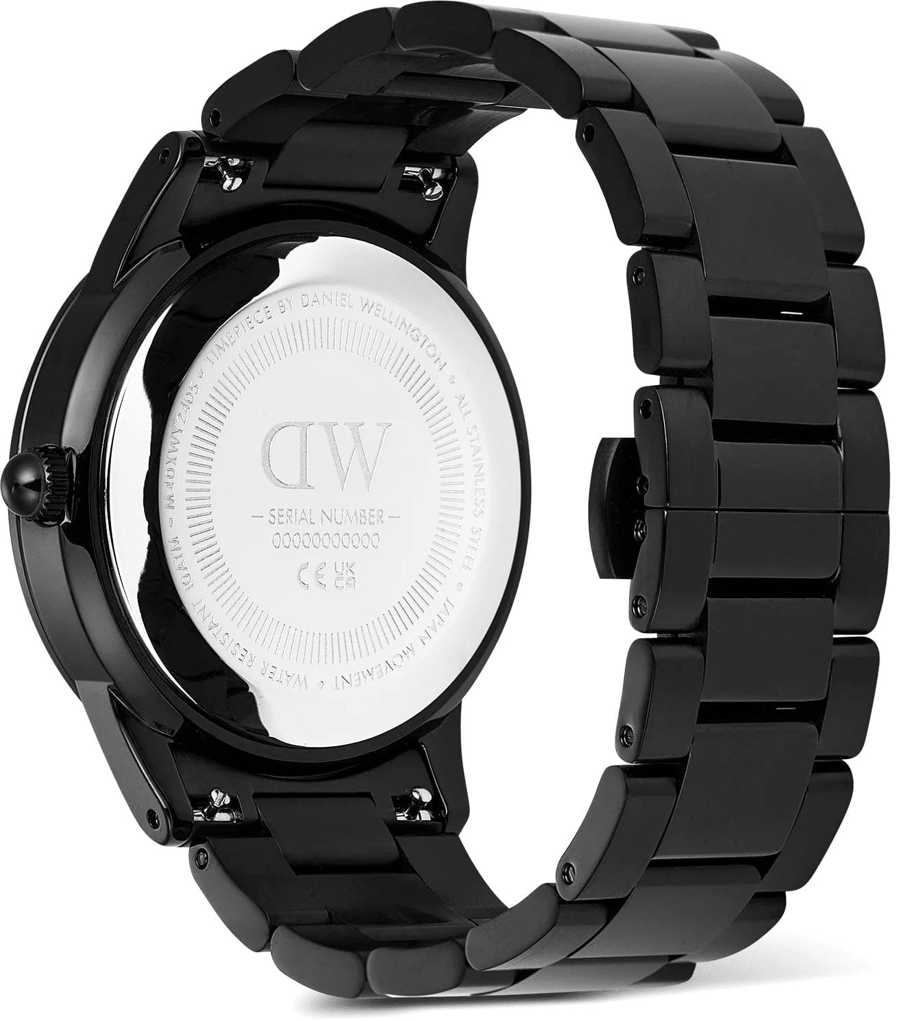 Daniel Wellington — мужские часы в современном спортивно-элегантном стиле. Круглый корпус диаметром 40 мм изготовлен из нержавеющей стали с PVD-покрытиемPVDУльтратонкое покрытие наносится в технике вакуумного напыления, сочетает в себе нитрид титана особой прочности со слоем золота или оксида хрома. Несёт в себе декоративную или защитную функцию. и дополнен чёрным безелемБезельВнешний ободок, закрепляющий стекло. В спортивных часах так называется поворотное кольцо с делениями на циферблате, выполняет роль таймера – замеряет отрезки времени на шкале. Неподвижный безель – элемент декора. Однонаправленно вращающийся безель на дайверских часах позволяет фиксировать моменты погружения и выныривания на поверхность. из анодированного алюминия, которое придаёт модели выразительный характер.