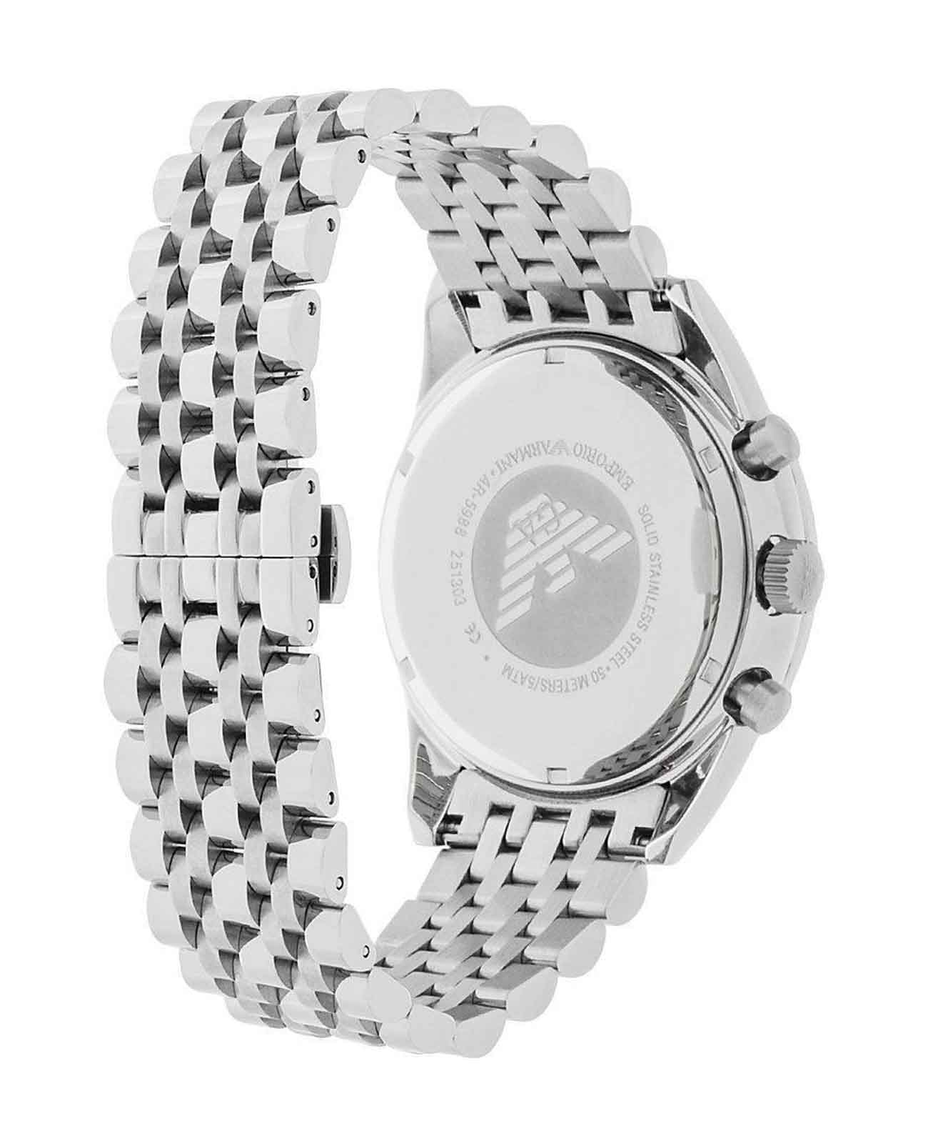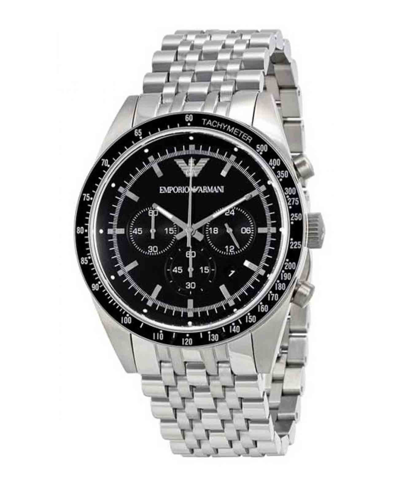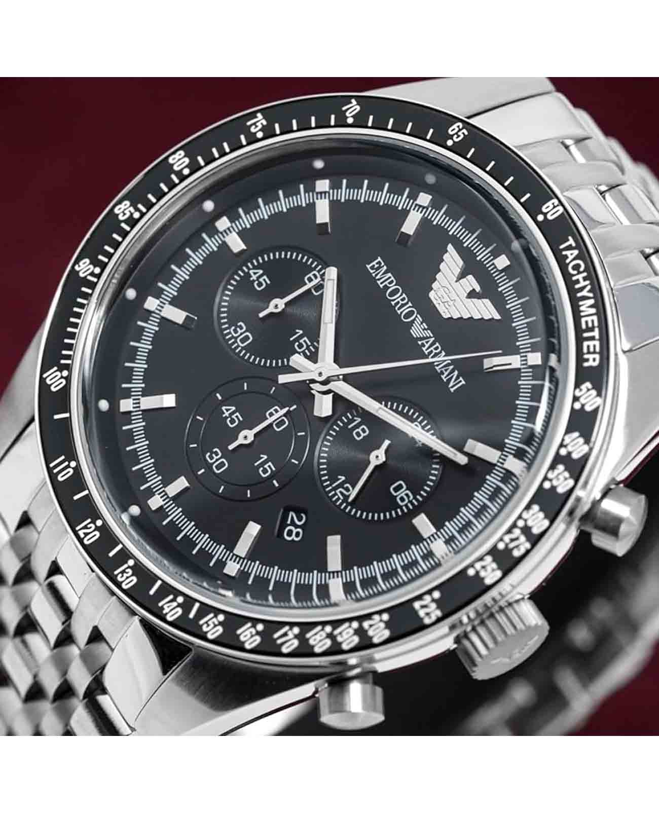 Мужские наручные часы-хронографХронографФункция позволяет измерять отрезки времени с особой точностью: часы, минуты, секунды. Верным признаком хронографа является наличие на циферблате 3 дополнительных окошек-счётчиков. с секундомеромСекундомерСекундоме́р — прибор, способный измерять интервалы времени с точностью до долей секунды. и минеральным стекломМинеральное стеклоМинеральное стекло представляет собой искусственно выращенный минерал кварца. Такое стекло отличается особой устойчивостью к повреждениям и царапинам. Уступает по некоторым качествам сапфировому стеклу. Emporio Armani Sportivo AR5988, кварцевый механизм с высокой точностью. Корпус часов изготовлен из стали. БезельБезельВнешний ободок, закрепляющий стекло. В спортивных часах так называется поворотное кольцо с делениями на циферблате, выполняет роль таймера – замеряет отрезки времени на шкале. Неподвижный безель – элемент декора. Однонаправленно вращающийся безель на дайверских часах позволяет фиксировать моменты погружения и выныривания на поверхность. с PVD-покрытиемPVDУльтратонкое покрытие наносится в технике вакуумного напыления, сочетает в себе нитрид титана особой прочности со слоем золота или оксида хрома. Несёт в себе декоративную или защитную функцию. с тахиметромТахиметрРазмеченная шкала, располагается на ободке или безеле часов. Тахиметр позволяет рассчитать скорость на определённом участке пути, расстояние измеряется в километрах или милях.. Окошко даты находится в положении между 4 и 5 часами. Стрелки и метки с люминесцентным покрытиемЛюминесцентное покрытиеПозволяет считывать показания времени в темноте. Производители наносят на стрелки, часовые индексы, безель или поверхность циферблата светонакопительный состав, дающий холодное свечение.. Класс водозащиты: 50 метров, позволит защитить корпус от случайных брызг или капель дождя. Стальной браслет на застёжке-бабочке с кнопкамиЗастёжка "бабочка"Такой вид застёжки дополняется предохранителями, помогающими избежать случайного раскрытия браслета. Обладают изящным исполнением. .