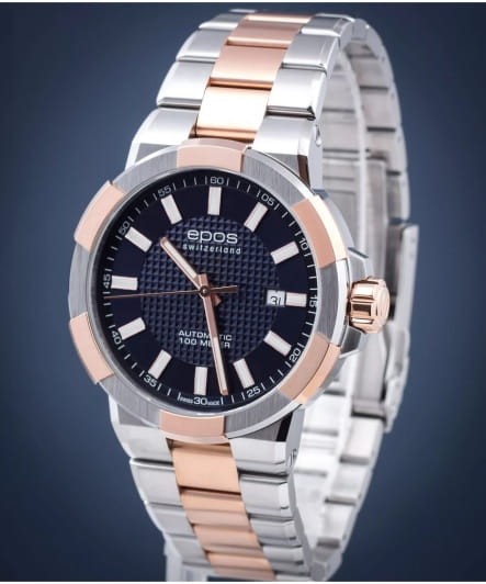 Мужские механические часы с автоподзаводом Epos из коллекции Sportive — это стильный аксессуар с швейцарским качеством и современным дизайном. Корпус диаметром 43,8 мм и толщиной 11 мм выполнен из нержавеющей стали 316L с PVD-покрытиемPVDУльтратонкое покрытие наносится в технике вакуумного напыления, сочетает в себе нитрид титана особой прочности со слоем золота или оксида хрома. Несёт в себе декоративную или защитную функцию.. Циферблат синего цвета оформлен метками и стрелками с люминесцентным покрытиемЛюминесцентное покрытиеПозволяет считывать показания времени в темноте. Производители наносят на стрелки, часовые индексы, безель или поверхность циферблата светонакопительный состав, дающий холодное свечение., обеспечивающим хорошую читаемость в темноте. Циферблат защищён сапфировым стекломСапфировое стеклоПрочный и надёжный материал из кристалла сапфира синтетического происхождения, характеризующийся особой твёрдостью и устойчивостью к царапинам и повреждениям.. Механизм — швейцарский калибр ETA 2824 с запасом хода 38 часов. Окошко даты расположено в положении 3 часов. Прозрачная задняя крышка позволяет наблюдать за работой декорированного механизма. Часы оснащены стальным браслетом комбинированного цвета на раскладной застёжкеРаскладная застёжкаТакой тип застёжки используется только на браслетах из металла. Она никогда не раскрывается полностью, происходит разделение на 2 и более частей. Раскладывающая застёжка снизит вероятность потери часов к минимуму.. Водонепроницаемость 100 м позволяет использовать часы для плавания и повседневного ношения. Гарантия — 24 месяца. Универсальный выбор для ценителя механики и элегантного стиля.