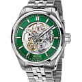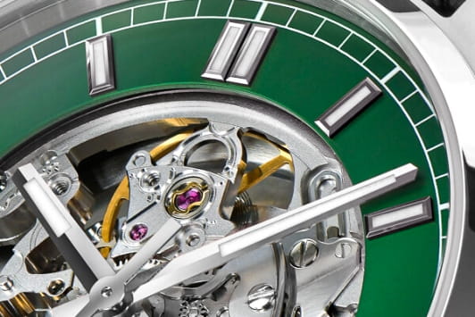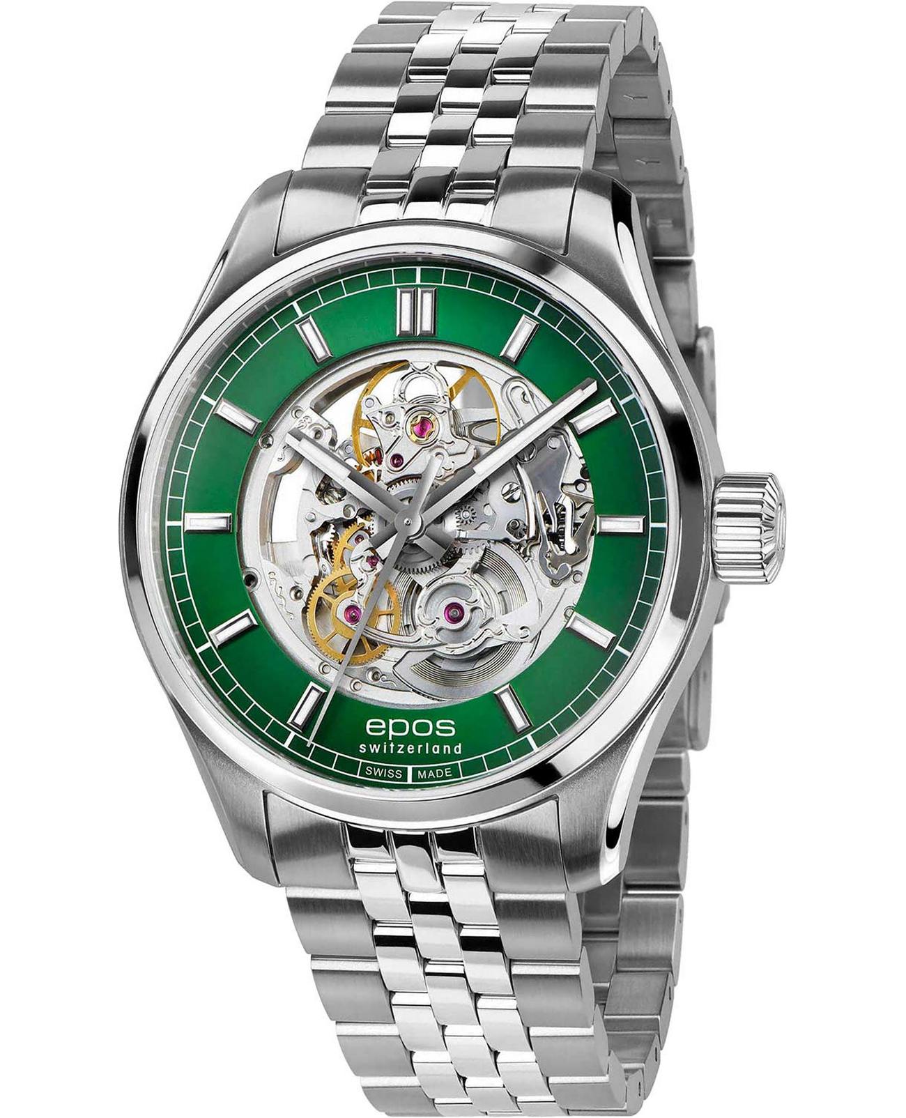 Мужские механические часы с автоподзаводом Epos из коллекции Passion — это сочетание швейцарского мастерства и современного дизайна. Корпус диаметром 41 мм и толщиной 11 мм выполнен из нержавеющей стали 316L. Циферблат зелёного цвета частично скелетонизирован, что позволяет наблюдать за работой механизма. Циферблат защищён сапфировым стекломСапфировое стеклоПрочный и надёжный материал из кристалла сапфира синтетического происхождения, характеризующийся особой твёрдостью и устойчивостью к царапинам и повреждениям.. Стрелки и метки с люминесцентным покрытиемЛюминесцентное покрытиеПозволяет считывать показания времени в темноте. Производители наносят на стрелки, часовые индексы, безель или поверхность циферблата светонакопительный состав, дающий холодное свечение., обеспечивающим хорошую читаемость в темноте. Механизм — швейцарский калибр Sellita SW200. Прозрачная задняя крышка открывает вид на декорированный механизм. Часы оснащены стальным браслетом на застёжке «бабочка» с кнопкамиЗастёжка "бабочка"Такой вид застёжки дополняется предохранителями, помогающими избежать случайного раскрытия браслета. Обладают изящным исполнением. . Водонепроницаемость 100 м позволяет использовать часы для плавания и повседневного ношения. Гарантия — 24 месяца. Универсальный выбор для ценителя механики и выразительного стиля.