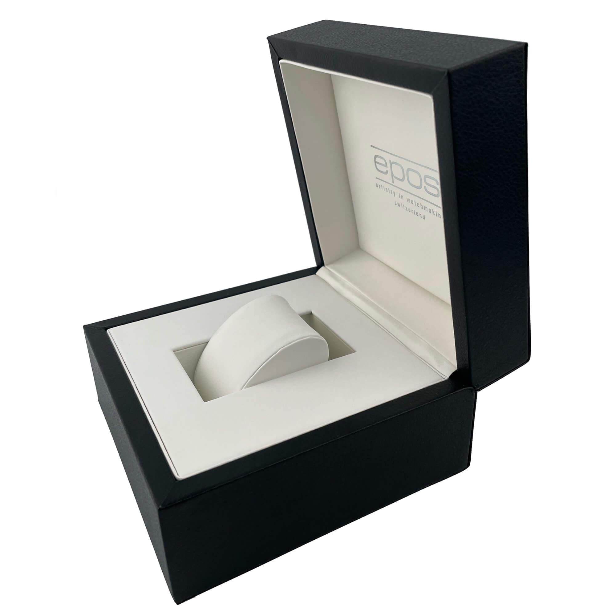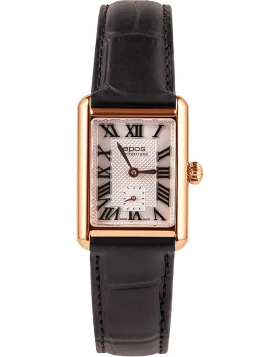 Epos 8002.702.24.20.15 — женская модель с утончённым классическим стилем и прямоугольным корпусом, выполненным из нержавеющей стали с PVD-покрытиемPVDУльтратонкое покрытие наносится в технике вакуумного напыления, сочетает в себе нитрид титана особой прочности со слоем золота или оксида хрома. Несёт в себе декоративную или защитную функцию.. Белый циферблат оформлен римскими индексами и утончённым узором «Clous de Paris», создающим игру света и подчёркивающим глубину дизайна. Защитную функцию выполняет сапфировое стеклоСапфировое стеклоПрочный и надёжный материал из кристалла сапфира синтетического происхождения, характеризующийся особой твёрдостью и устойчивостью к царапинам и повреждениям., стойкое к царапинам и сохраняющее прозрачность. В основе лежит швейцарский автоматический механизм, обеспечивающий стабильность и точность хода. Функции включают индикацию часов, минут и малую секундную шкалу, расположенную в позиции «6 часов». Часы дополнены кожаным ремешком, который гармонично завершает строгий образ модели.