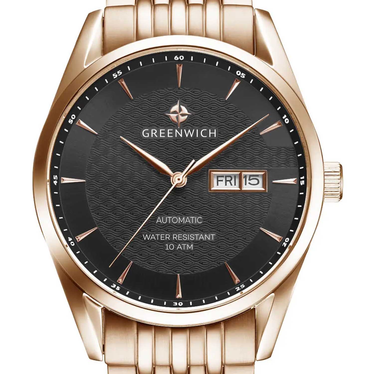Мужские часы с минеральным стекломМинеральное стеклоМинеральное стекло представляет собой искусственно выращенный минерал кварца. Такое стекло отличается особой устойчивостью к повреждениям и царапинам. Уступает по некоторым качествам сапфировому стеклу. Greenwich Good Luck Classic GW 074.40.31, представляют собой классический вариант для повседневной носки. В центральной части циферблата — отличительная черта моделей этой серии: гильоше, объемные линии которого напоминают волны. Обратите внимание на форму пластины, где крепятся накладные риски: она сделана в форме латинской буквы G, первой буквы в названии бренда. Часы характеризуются традиционными формами, лаконичным исполнением, что делает модель элегантным дополнением к деловому костюму. Сквозь прозрачную заднюю крышку вы увидите детали механизма TMI с декорированным ротором: на нем выгравировано изображение символа английских моряков — парусника. Корпус, браслет и раскладная застёжкаРаскладная застёжкаТакой тип застёжки используется только на браслетах из металла. Она никогда не раскрывается полностью, происходит разделение на 2 и более частей. Раскладывающая застёжка снизит вероятность потери часов к минимуму. выполнены из гипоаллергенной нержавеющей стали с PVD-покрытиемPVDУльтратонкое покрытие наносится в технике вакуумного напыления, сочетает в себе нитрид титана особой прочности со слоем золота или оксида хрома. Несёт в себе декоративную или защитную функцию.. Дизайн, актуальный для любого современного образа, и надежность используемых материалов делают автоматические часы Greenwich удобным и стильным аксессуаром на каждый день. Окошко даты и дня недели находится в положении 3 часа. Класс водозащиты: 100 метров, позволит плавать, нырять и заниматься другими водными видами спорта.