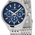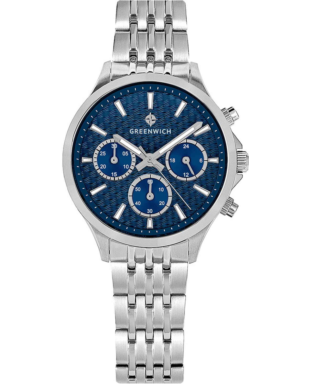 Женские кварцевые часы Greenwich — это сочетание элегантности и функциональности. Корпус диаметром 35 мм выполнен из нержавеющей стали. Циферблат синего цвета оформлен с эффектом гильоше в виде волнообразных линий, придающим ему объём и глубину. На циферблате расположены субциферблаты хронографа (секундомер на 60 секунд и 30 минут) и индикатор 24-часового формата. Окошко даты находится в положении 3 часов. Все индикаторы выделены рамками с зеркальной полировкой. Стрелки и метки с люминесцентным покрытиемЛюминесцентное покрытиеПозволяет считывать показания времени в темноте. Производители наносят на стрелки, часовые индексы, безель или поверхность циферблата светонакопительный состав, дающий холодное свечение., обеспечивающим хорошую читаемость в темноте. Циферблат защищён минеральным стекломМинеральное стеклоМинеральное стекло представляет собой искусственно выращенный минерал кварца. Такое стекло отличается особой устойчивостью к повреждениям и царапинам. Уступает по некоторым качествам сапфировому стеклу.. Механизм — кварцевый калибр Miyota с функцией хронографа. Часы оснащены стальным браслетом с комбинированной полировкой (матовые и зеркальные звенья) и удобной раскладной застёжкойРаскладная застёжкаТакой тип застёжки используется только на браслетах из металла. Она никогда не раскрывается полностью, происходит разделение на 2 и более частей. Раскладывающая застёжка снизит вероятность потери часов к минимуму.. Водонепроницаемость 100 м позволяет использовать часы для плавания и повседневного ношения. Гарантия — 24 месяца. Идеальный выбор для тех, кто ценит стиль, точность и надёжность.