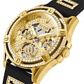 Женские наручные часы-скелетоны с минеральным стекломМинеральное стеклоМинеральное стекло представляет собой искусственно выращенный минерал кварца. Такое стекло отличается особой устойчивостью к повреждениям и царапинам. Уступает по некоторым качествам сапфировому стеклу. Guess Queen GW0536L3, кварцевый механизм с высокой точностью. Класс водозащиты: 30 метров, позволит защитить корпус от случайных брызг или капель дождя. Корпус часов изготовлен из стали с IP-покрытиемIP-покрытиеМетод ионного напыления. Демонстрирует повышенную устойчивость к истиранию, окислению и химическим веществам. Под воздействием высокого давления и температуры около 1500°C молекулы металла надёжно соединяются с частицами корпуса часов.. Силиконовый ремешок на стандартной застёжке. 24-х часовой формат времени, дата и день недели вынесены на отдельные циферблаты. Метки в виде штрихов. Рифленая заводная головка с защитой. Циферблат и ремешок украшены кристаллами.