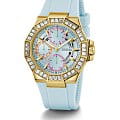 Женские наручные часы Guess GW0695L1 с минеральным стекломМинеральное стеклоМинеральное стекло представляет собой искусственно выращенный минерал кварца. Такое стекло отличается особой устойчивостью к повреждениям и царапинам. Уступает по некоторым качествам сапфировому стеклу., кварцевый механизм с высокой точностью. Корпус часов изготовлен из стали с IP-покрытиемIP-покрытиеМетод ионного напыления. Демонстрирует повышенную устойчивость к истиранию, окислению и химическим веществам. Под воздействием высокого давления и температуры около 1500°C молекулы металла надёжно соединяются с частицами корпуса часов.. Стрелки с люминесцентным покрытиемЛюминесцентное покрытиеПозволяет считывать показания времени в темноте. Производители наносят на стрелки, часовые индексы, безель или поверхность циферблата светонакопительный состав, дающий холодное свечение.. Класс водозащиты: 50 метров, позволит защитить корпус от случайных брызг или капель дождя. Силиконовый ремешок.