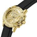Женские наручные часы Guess Dress GW0772L5 с минеральным стекломМинеральное стеклоМинеральное стекло представляет собой искусственно выращенный минерал кварца. Такое стекло отличается особой устойчивостью к повреждениям и царапинам. Уступает по некоторым качествам сапфировому стеклу., кварцевый механизм с высокой точностью. Корпус часов изготовлен из стали с PVD-покрытиемPVDУльтратонкое покрытие наносится в технике вакуумного напыления, сочетает в себе нитрид титана особой прочности со слоем золота или оксида хрома. Несёт в себе декоративную или защитную функцию.. БезельБезельВнешний ободок, закрепляющий стекло. В спортивных часах так называется поворотное кольцо с делениями на циферблате, выполняет роль таймера – замеряет отрезки времени на шкале. Неподвижный безель – элемент декора. Однонаправленно вращающийся безель на дайверских часах позволяет фиксировать моменты погружения и выныривания на поверхность. с PVD-покрытиемPVDУльтратонкое покрытие наносится в технике вакуумного напыления, сочетает в себе нитрид титана особой прочности со слоем золота или оксида хрома. Несёт в себе декоративную или защитную функцию. украшен кристаллами. Стрелки с люминесцентным покрытиемЛюминесцентное покрытиеПозволяет считывать показания времени в темноте. Производители наносят на стрелки, часовые индексы, безель или поверхность циферблата светонакопительный состав, дающий холодное свечение.. Класс водозащиты: 50 метров, позволит защитить корпус от случайных брызг или капель дождя. Силиконовый ремешок с простой ремешковой застежкой.