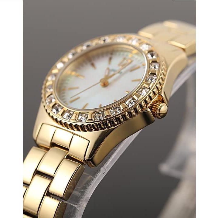Женские наручные часы Guess Sport W0025L2 — изысканный аксессуар, сочетающий в себе элегантность и современный стиль. Круглый корпус из стали с золотистым IP-покрытиемIP-покрытиеМетод ионного напыления. Демонстрирует повышенную устойчивость к истиранию, окислению и химическим веществам. Под воздействием высокого давления и температуры около 1500°C молекулы металла надёжно соединяются с частицами корпуса часов., диаметром 28 мм придает часам прочность и устойчивость к износу, обеспечивая их привлекательный внешний вид на долгие годы. Циферблат украшен метками в виде штрихов, что придает часам утонченность и изысканность. Минеральное стеклоМинеральное стеклоМинеральное стекло представляет собой искусственно выращенный минерал кварца. Такое стекло отличается особой устойчивостью к повреждениям и царапинам. Уступает по некоторым качествам сапфировому стеклу. защищает циферблат от царапин и других повреждений. Люминесцентное покрытиеЛюминесцентное покрытиеПозволяет считывать показания времени в темноте. Производители наносят на стрелки, часовые индексы, безель или поверхность циферблата светонакопительный состав, дающий холодное свечение. на стрелках обеспечивает отличную видимость в темноте. БезельБезельВнешний ободок, закрепляющий стекло. В спортивных часах так называется поворотное кольцо с делениями на циферблате, выполняет роль таймера – замеряет отрезки времени на шкале. Неподвижный безель – элемент декора. Однонаправленно вращающийся безель на дайверских часах позволяет фиксировать моменты погружения и выныривания на поверхность. дополнен кристаллами, которые добавляют аксессуару оригинальность и характер. Рифленая заводная головка обеспечивает удобство в использовании и подчеркивает внимание к деталям. Часы оснащены стальным браслетом с золотистым IP-покрытиемIP-покрытиеМетод ионного напыления. Демонстрирует повышенную устойчивость к истиранию, окислению и химическим веществам. Под воздействием высокого давления и температуры около 1500°C молекулы металла надёжно соединяются с частицами корпуса часов., который обеспечивает надежность и комфорт. Раскладная застежкаРаскладная застёжкаТакой тип застёжки используется только на браслетах из металла. Она никогда не раскрывается полностью, происходит разделение на 2 и более частей. Раскладывающая застёжка снизит вероятность потери часов к минимуму. гарантирует легкость и безопасность при ношении. Водозащита уровня 50WR защищает часы от случайных брызг, делая их подходящими для повседневного использования.