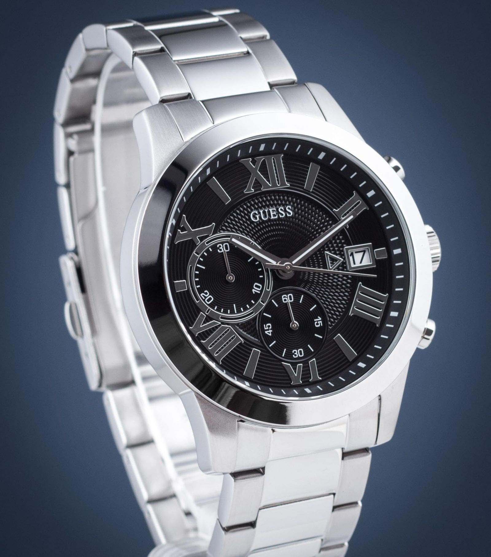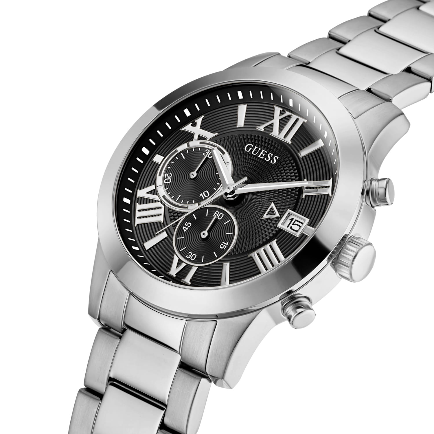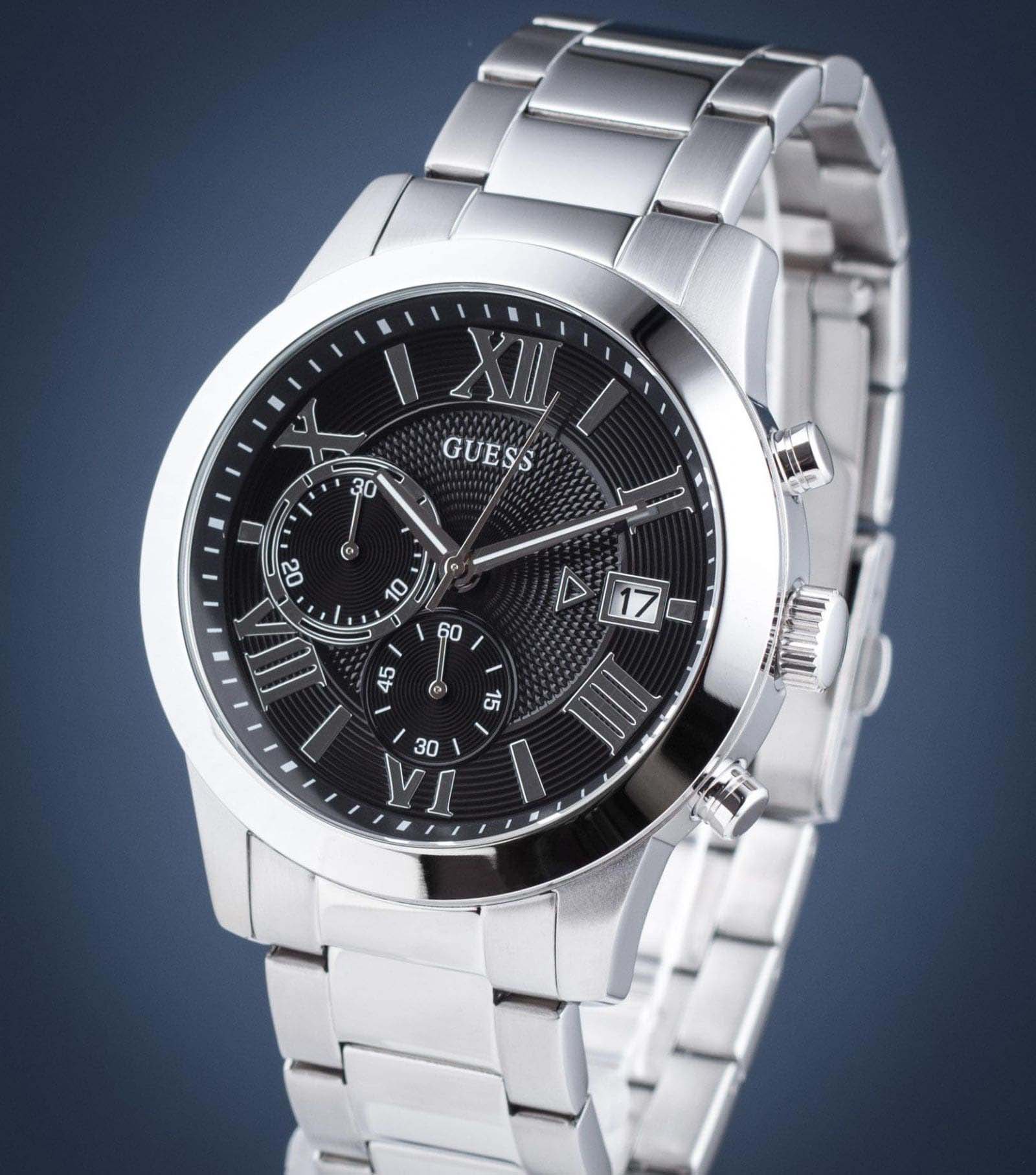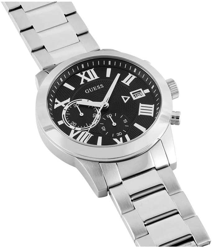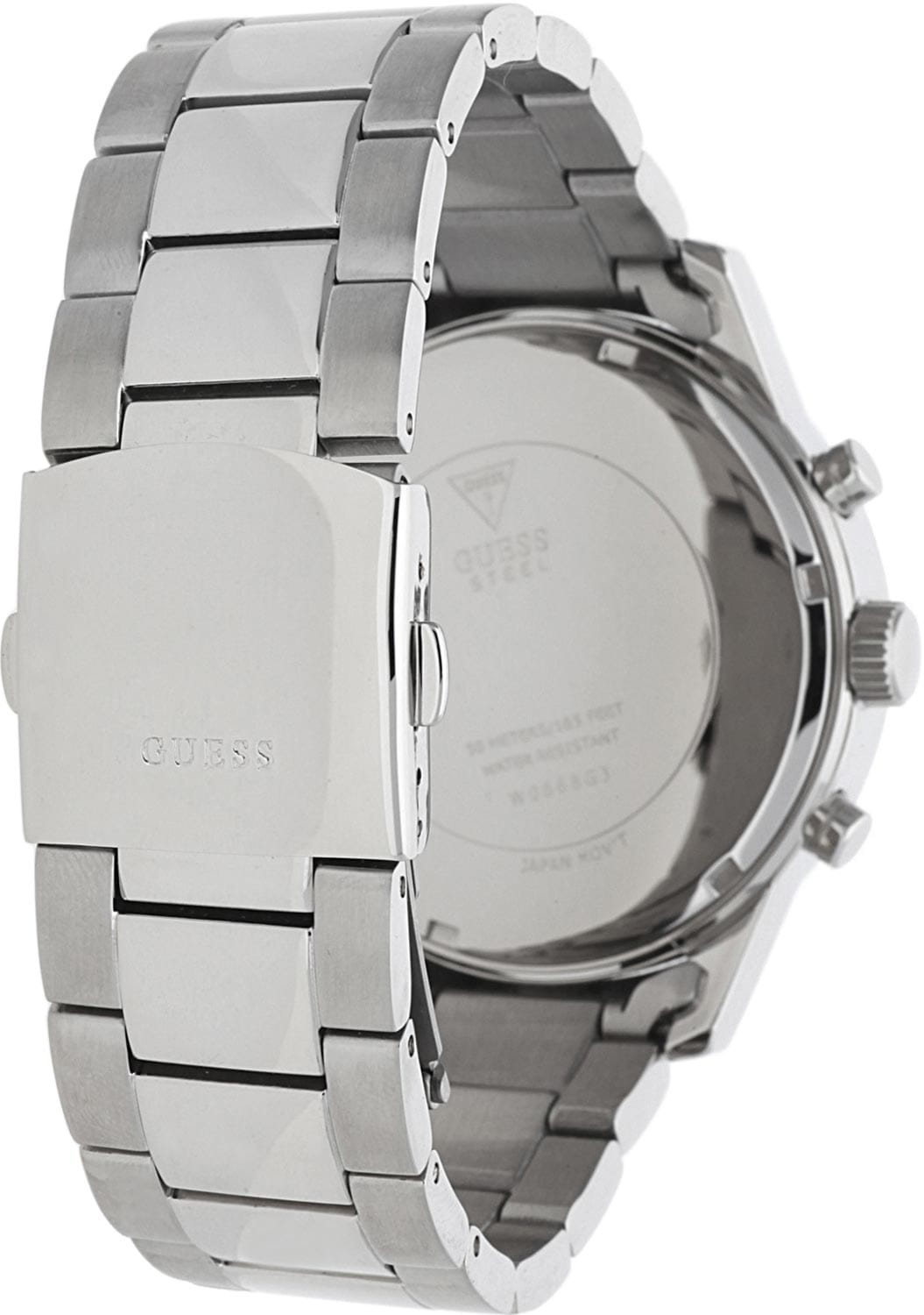 Мужские наручные часы-хронографХронографФункция позволяет измерять отрезки времени с особой точностью: часы, минуты, секунды. Верным признаком хронографа является наличие на циферблате 3 дополнительных окошек-счётчиков. с секундомеромСекундомерСекундоме́р — прибор, способный измерять интервалы времени с точностью до долей секунды. Guess Atlas W0668G3, кварцевый механизм с высокой точностью. Класс водозащиты: 50 метров, позволит защитить корпус от случайных брызг или капель дождя. Корпус часов изготовлен из стали. Стальной браслет на раскладной застёжкеРаскладная застёжкаТакой тип застёжки используется только на браслетах из металла. Она никогда не раскрывается полностью, происходит разделение на 2 и более частей. Раскладывающая застёжка снизит вероятность потери часов к минимуму.. Стрелки с люминесцентным покрытиемЛюминесцентное покрытиеПозволяет считывать показания времени в темноте. Производители наносят на стрелки, часовые индексы, безель или поверхность циферблата светонакопительный состав, дающий холодное свечение.. Окошко даты находится в положении 3 часа.