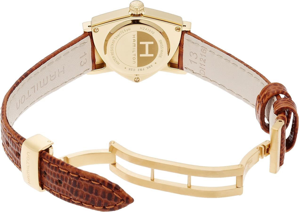 Женские наручные часы Hamilton Ventura Quartz H24101511 с надёжным кварцевым механизмом. Корпус часов изготовлен из нержавеющей стали с PVD-покрытиемPVDУльтратонкое покрытие наносится в технике вакуумного напыления, сочетает в себе нитрид титана особой прочности со слоем золота или оксида хрома. Несёт в себе декоративную или защитную функцию.. Практичный кожаный ремешок на застёжке "Бабочка". Минеральное стеклоМинеральное стеклоМинеральное стекло представляет собой искусственно выращенный минерал кварца. Такое стекло отличается особой устойчивостью к повреждениям и царапинам. Уступает по некоторым качествам сапфировому стеклу. устойчивое к мелким механическим повреждениям. Класс водозащиты: 50 метров, позволит защитить корпус от случайных брызг или капель дождя.