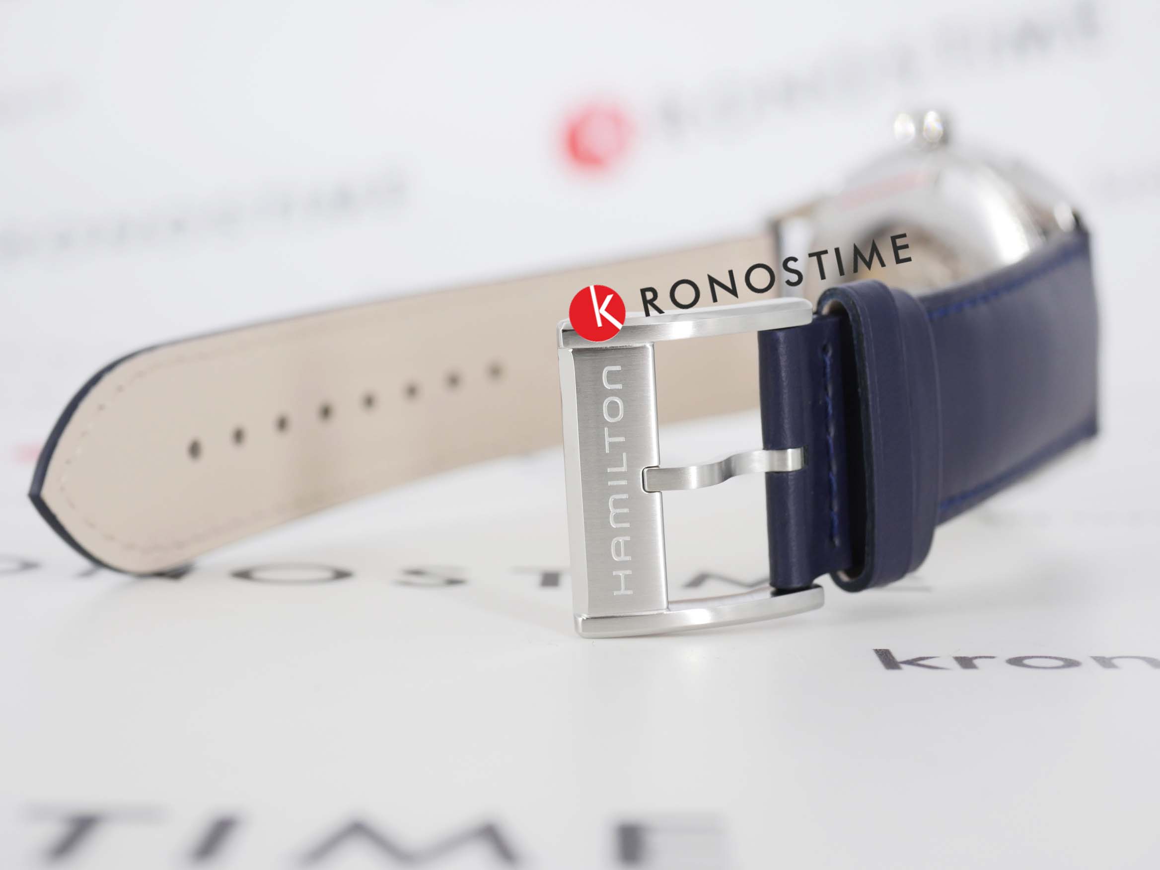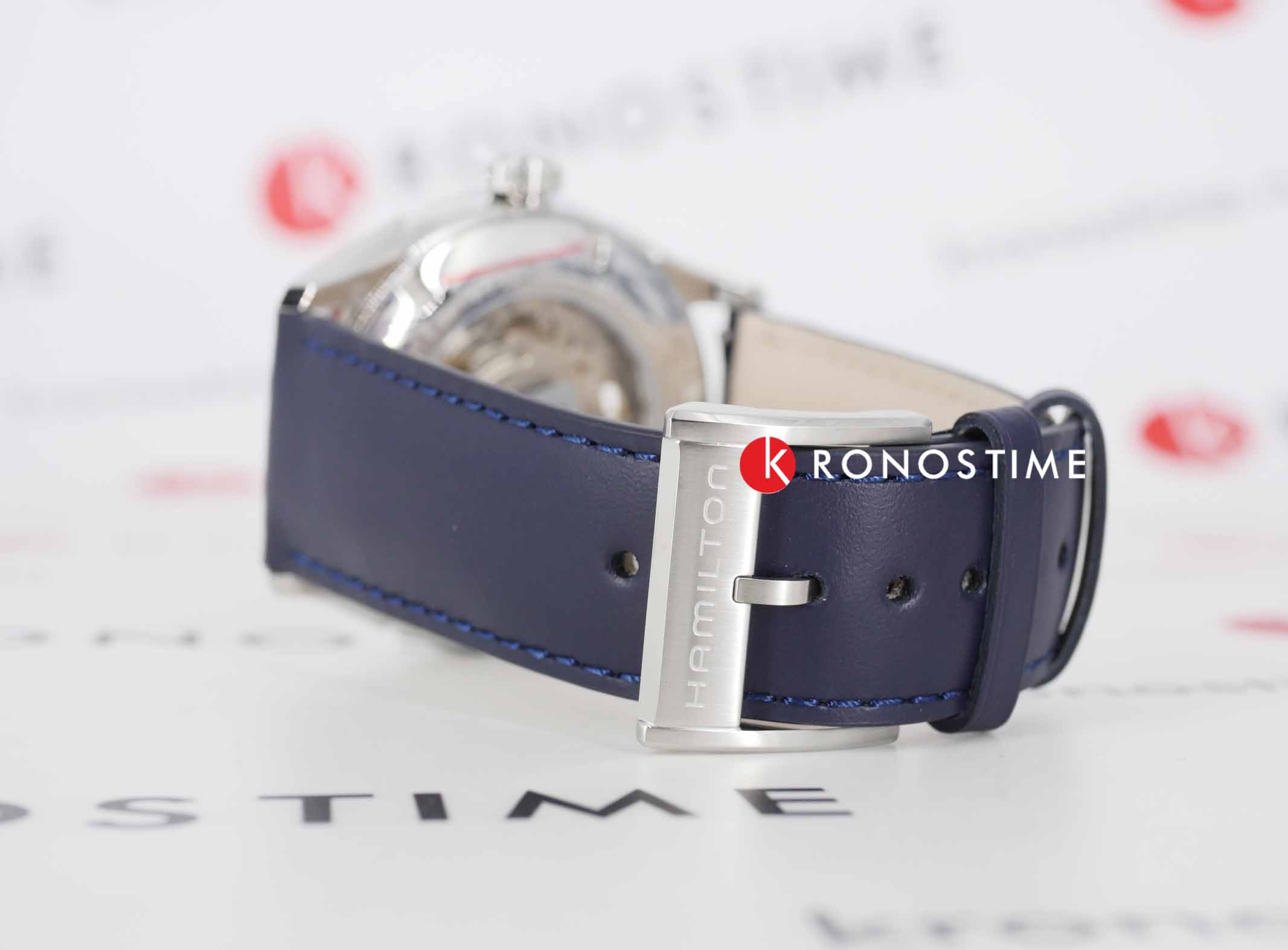 Hamilton Jazzmaster Open Heart Auto H32705640 – элегантные мужские часы, сочетающие классический дизайн и современные технологии. Корпус диаметром 42 мм выполнен из нержавеющей стали, обеспечивая прочность и долговечность. Градиентный циферблат с вырезами, открывающими механизм, придаёт модели уникальный характер и стиль, а его поверхность защищена сапфировым стекломСапфировое стеклоПрочный и надёжный материал из кристалла сапфира синтетического происхождения, характеризующийся особой твёрдостью и устойчивостью к царапинам и повреждениям., устойчивым к царапинам. Часы оснащены автоматическим калибром H-10 с технологией Powermatic 80Powermatic 80Эксклюзивный калибр от швейцарской компании ETA с увеличенным запасом хода до 80 часов за счёт удлинённой заводной пружины. Характеризуется улучшенной системой спуска со сниженным трением., обеспечивающей запас хода до 80 часов и стабильную точность. Прозрачная задняя крышка позволяет наблюдать за работой механизма, добавляя эстетическую привлекательность. Синий кожаный ремешок с классической пряжкой обеспечивает комфортное ношение и надёжную фиксацию на запястье. Водозащита до 50 метров (5 бар) делает часы подходящими для повседневного использования и защищает их от случайных брызг и дождя.