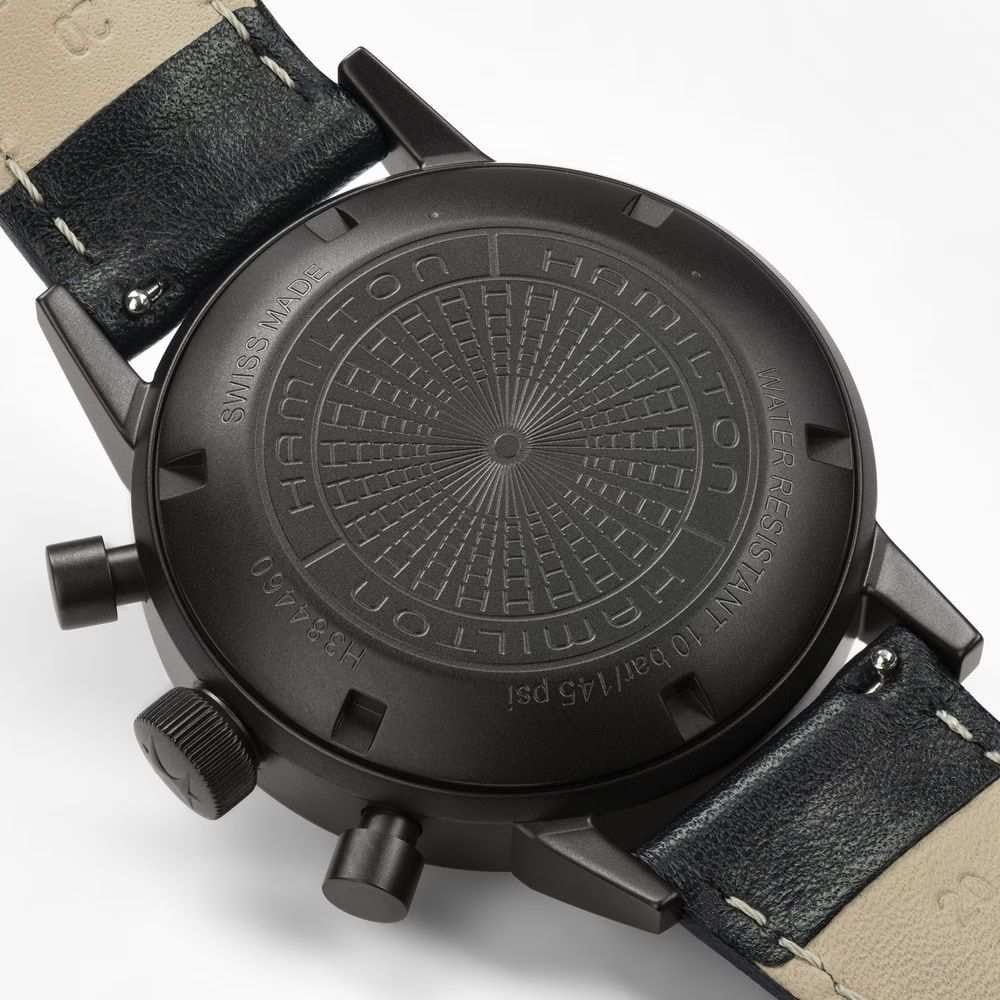 Hamilton Intra-Matic Auto Chrono H38446732 — выразительный хронограф с насыщенной винтажной эстетикой и современным техническим исполнением. Корпус диаметром 40 мм выполнен из нержавеющей стали с PVD-покрытиемPVDУльтратонкое покрытие наносится в технике вакуумного напыления, сочетает в себе нитрид титана особой прочности со слоем золота или оксида хрома. Несёт в себе декоративную или защитную функцию. чёрного цвета, придающим часам элегантность и строгость. Циферблат защищён выпуклым сапфировым стекломСапфировое стеклоПрочный и надёжный материал из кристалла сапфира синтетического происхождения, характеризующийся особой твёрдостью и устойчивостью к царапинам и повреждениям. с антибликовым покрытиемАнтибликовое покрытиеСлой оксида металла в 0,13-0,3 микрон, благодаря которому стекло часов не бликует и не отражает свет. Антибликовое покрытие уменьшает отражение света в 10 раз, обеспечивая отличную читаемость показателей циферблата., устойчивым к царапинам и бликам. Чёрный матовый циферблат оформлен в стиле «панда» с двумя белыми субциферблатами: малой секундной стрелкой и 30-минутным счётчиком. Указатели и стрелки покрыты люминесцентным покрытиемЛюминесцентное покрытиеПозволяет считывать показания времени в темноте. Производители наносят на стрелки, часовые индексы, безель или поверхность циферблата светонакопительный состав, дающий холодное свечение. для хорошей читаемости в тёмное время. Также присутствует тахиметрическая шкала и окно даты на «6 часах». Модель оснащена автоматическим хронографомХронографФункция позволяет измерять отрезки времени с особой точностью: часы, минуты, секунды. Верным признаком хронографа является наличие на циферблате 3 дополнительных окошек-счётчиков. калибра H-31 (на базе ETA/Valjoux 7753) с запасом хода до 60 часов. Часы комплектуются перфорированным чёрным кожаным ремешком в спортивном стиле с классической застёжкой-пряжкой. Водонепроницаемость 100 метров делает модель подходящей как для повседневного ношения, так и для активного образа жизни. Intra-Matic Auto Chrono — идеальный выбор для тех, кто ценит винтажный стиль, функциональность и швейцарскую механику.