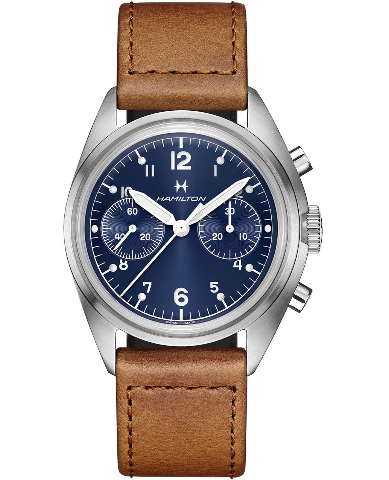 Мужские стильные швейцарские часы Hamilton Khaki Aviation Pilot Pioneer Mechanical Chronograph 40mm H76409540. Стальной корпус диаметром 40 мм и толщиной 14,35 мм подчеркивает брутальность модели, а сапфировое стеклоСапфировое стеклоПрочный и надёжный материал из кристалла сапфира синтетического происхождения, характеризующийся особой твёрдостью и устойчивостью к царапинам и повреждениям. с антибликовым покрытиемАнтибликовое покрытиеСлой оксида металла в 0,13-0,3 микрон, благодаря которому стекло часов не бликует и не отражает свет. Антибликовое покрытие уменьшает отражение света в 10 раз, обеспечивая отличную читаемость показателей циферблата. обеспечивает превосходную читаемость матового синего циферблата со стрелками с люминесцентным покрытиемЛюминесцентное покрытиеПозволяет считывать показания времени в темноте. Производители наносят на стрелки, часовые индексы, безель или поверхность циферблата светонакопительный состав, дающий холодное свечение. Super-LumiNova®. Модель оснащена функцией хронографаХронографФункция позволяет измерять отрезки времени с особой точностью: часы, минуты, секунды. Верным признаком хронографа является наличие на циферблате 3 дополнительных окошек-счётчиков.. Механизм с ручным заводом H-51 оснащен кремниевой спиралью, обеспечивающей запас хода 60 часов и устойчивость к магнитным полям. Изысканный ремешок выполнен из кожи со стандартной застежкой, гарантирующей комфортное ношение и безопасность. Водонепроницаемость часов достигает 10 атмосфер (100 метров), делающая их подходящими для повседневного использования и активного отдыха. Это сочетание высокой прочности, точности и изысканного дизайна для уверенных в себе мужчин.