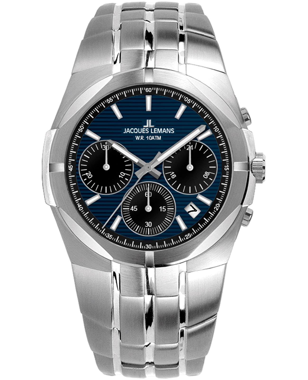 Женские кварцевые часы-хронографХронографФункция позволяет измерять отрезки времени с особой точностью: часы, минуты, секунды. Верным признаком хронографа является наличие на циферблате 3 дополнительных окошек-счётчиков. Jacques Lemans 1-2183C с минеральным стекломМинеральное стеклоМинеральное стекло представляет собой искусственно выращенный минерал кварца. Такое стекло отличается особой устойчивостью к повреждениям и царапинам. Уступает по некоторым качествам сапфировому стеклу.. Корпус выполнен из нержавеющей стали. Стрелки и метки с люминесцентным покрытиемЛюминесцентное покрытиеПозволяет считывать показания времени в темноте. Производители наносят на стрелки, часовые индексы, безель или поверхность циферблата светонакопительный состав, дающий холодное свечение.. Окошко даты находится в положении между 4 и 5 часами. Класс водозащиты: 100 метров, позволит плавать, нырять и заниматься другими водными видами спорта.