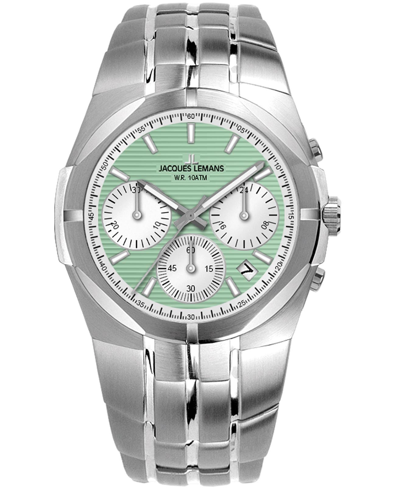 Женские кварцевые часы-хронографХронографФункция позволяет измерять отрезки времени с особой точностью: часы, минуты, секунды. Верным признаком хронографа является наличие на циферблате 3 дополнительных окошек-счётчиков. Jacques Lemans 1-2183E с минеральным стекломМинеральное стеклоМинеральное стекло представляет собой искусственно выращенный минерал кварца. Такое стекло отличается особой устойчивостью к повреждениям и царапинам. Уступает по некоторым качествам сапфировому стеклу.. Корпус выполнен из нержавеющей стали. Стрелки и метки с люминесцентным покрытиемЛюминесцентное покрытиеПозволяет считывать показания времени в темноте. Производители наносят на стрелки, часовые индексы, безель или поверхность циферблата светонакопительный состав, дающий холодное свечение.. Окошко даты находится в положении между 4 и 5 часами. Класс водозащиты: 100 метров, позволит плавать, нырять и заниматься другими водными видами спорта.