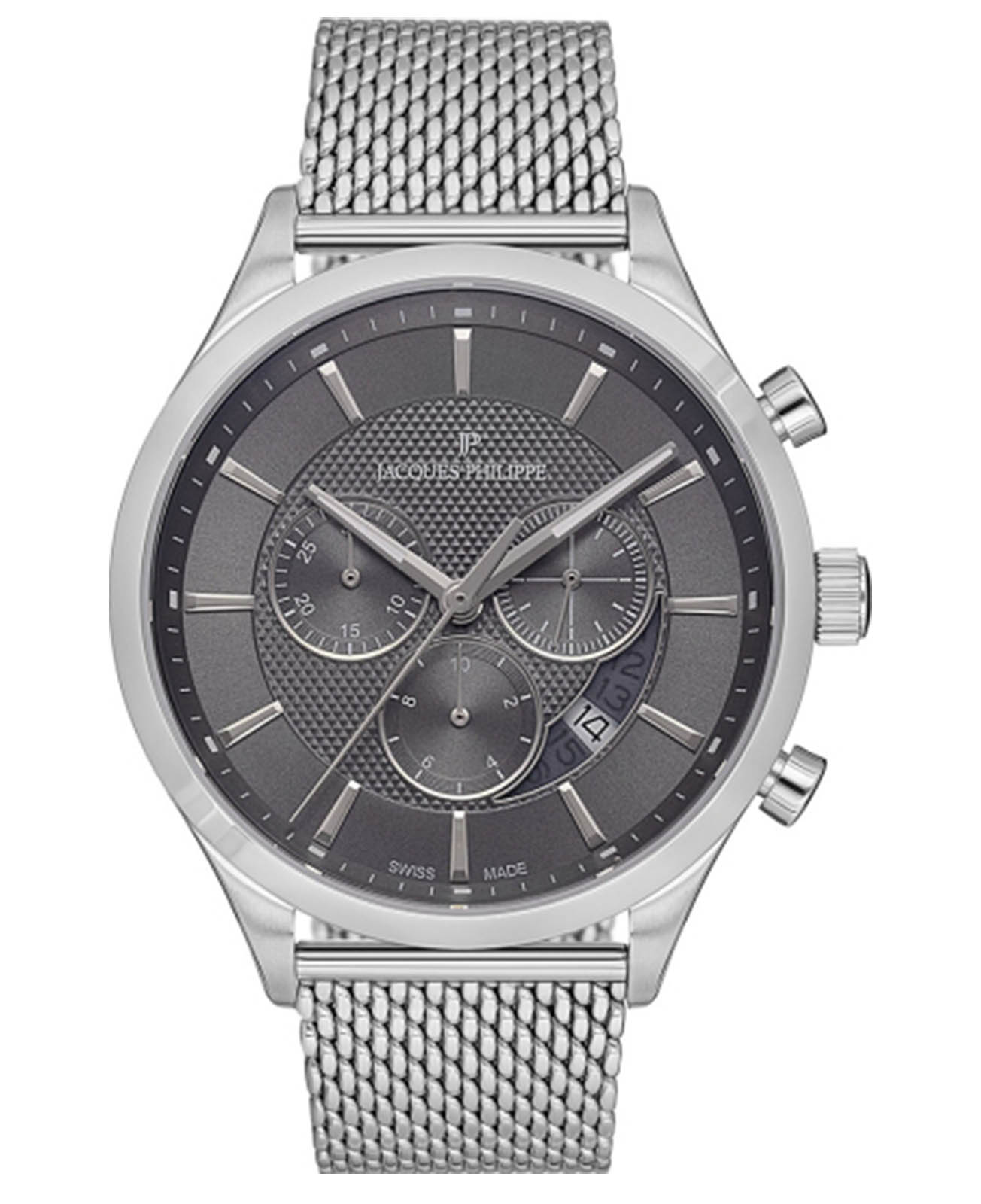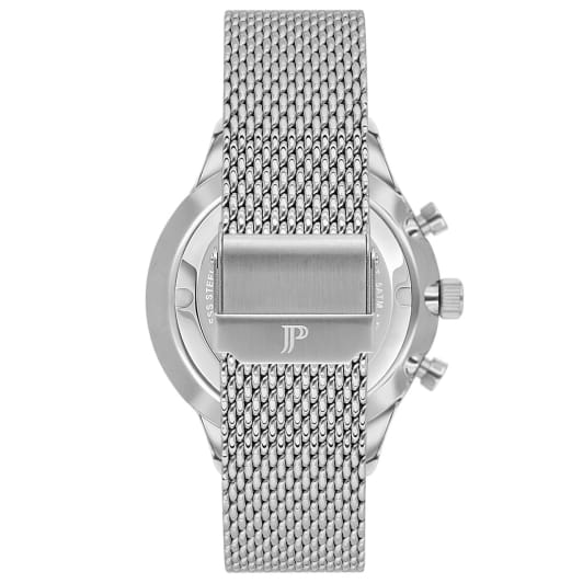 Швейцарские мужские часы-хронографХронографФункция позволяет измерять отрезки времени с особой точностью: часы, минуты, секунды. Верным признаком хронографа является наличие на циферблате 3 дополнительных окошек-счётчиков. Jacques Philippe Gallant JPQGC031216, кварцевый механизм с высокой точностью. Сапфировое стеклоСапфировое стеклоПрочный и надёжный материал из кристалла сапфира синтетического происхождения, характеризующийся особой твёрдостью и устойчивостью к царапинам и повреждениям. устойчивое к появлению царапин, обладающее высокой прозрачностью. Корпус часов изготовлен из нержавеющей стали. На циферблате три дополнительных индикатора. Стрелки с люминесцентным покрытиемЛюминесцентное покрытиеПозволяет считывать показания времени в темноте. Производители наносят на стрелки, часовые индексы, безель или поверхность циферблата светонакопительный состав, дающий холодное свечение.. Окошко даты находится между 4 и 5 часами. Класс водозащиты: 50 метров, позволит защитить корпус от случайных брызг или капель дождя. Стальной браслет миланского плетения на раскладном замкеРаскладной замокДанный вариант застежки используется только на часах с металлическим браслетом. Отличительная особенность такого крепления в том, что длина браслета становится универсальной и вы можете самостоятельно отрегулировать нужный вам размер – застежка просто двигается по браслету часов..