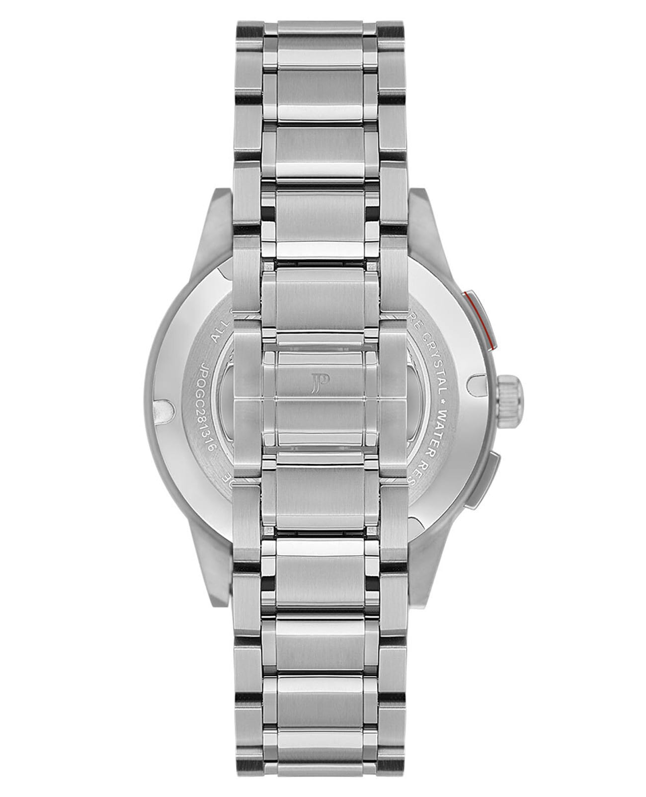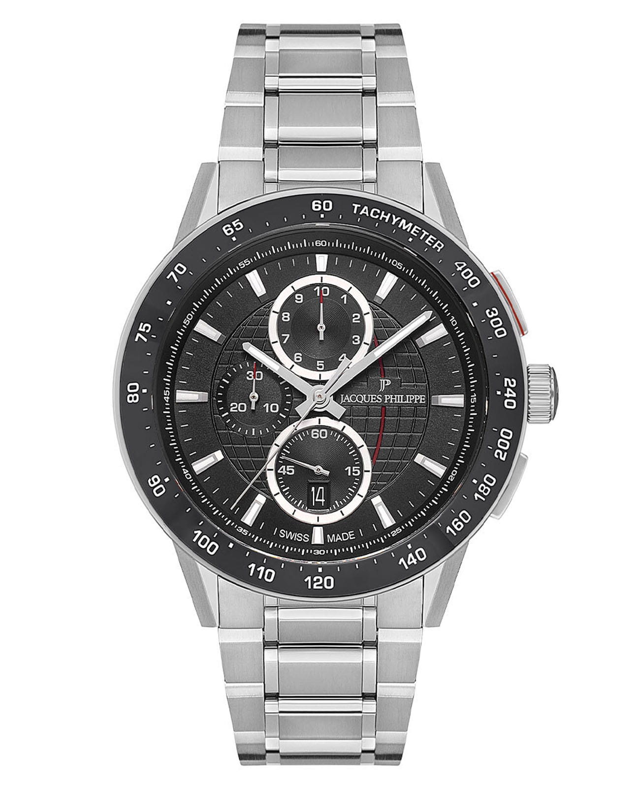 Швейцарские мужские часы-хронографХронографФункция позволяет измерять отрезки времени с особой точностью: часы, минуты, секунды. Верным признаком хронографа является наличие на циферблате 3 дополнительных окошек-счётчиков. с секундомеромСекундомерСекундоме́р — прибор, способный измерять интервалы времени с точностью до долей секунды. Jacques Philippe Globus JPQGC281316, кварцевый механизм с высокой точностью. Сапфировое стеклоСапфировое стеклоПрочный и надёжный материал из кристалла сапфира синтетического происхождения, характеризующийся особой твёрдостью и устойчивостью к царапинам и повреждениям. устойчивое к появлению царапин, обладающее высокой прозрачностью. Корпус часов изготовлен из нержавеющей стали. БезельБезельВнешний ободок, закрепляющий стекло. В спортивных часах так называется поворотное кольцо с делениями на циферблате, выполняет роль таймера – замеряет отрезки времени на шкале. Неподвижный безель – элемент декора. Однонаправленно вращающийся безель на дайверских часах позволяет фиксировать моменты погружения и выныривания на поверхность. из стали с IP-покрытиемIP-покрытиеМетод ионного напыления. Демонстрирует повышенную устойчивость к истиранию, окислению и химическим веществам. Под воздействием высокого давления и температуры около 1500°C молекулы металла надёжно соединяются с частицами корпуса часов. и с тахиметромТахиметрРазмеченная шкала, располагается на ободке или безеле часов. Тахиметр позволяет рассчитать скорость на определённом участке пути, расстояние измеряется в километрах или милях.. На циферблате три дополнительных индикатора. Окошко даты находится в положении 6 часов. Стрелки с люминесцентным покрытиемЛюминесцентное покрытиеПозволяет считывать показания времени в темноте. Производители наносят на стрелки, часовые индексы, безель или поверхность циферблата светонакопительный состав, дающий холодное свечение.. Класс водозащиты: 100 метров, позволит плавать, нырять и заниматься другими водными видами спорта. Стальной браслет на застёжке «бабочка» с кнопкамиЗастёжка "бабочка"Такой вид застёжки дополняется предохранителями, помогающими избежать случайного раскрытия браслета. Обладают изящным исполнением. .