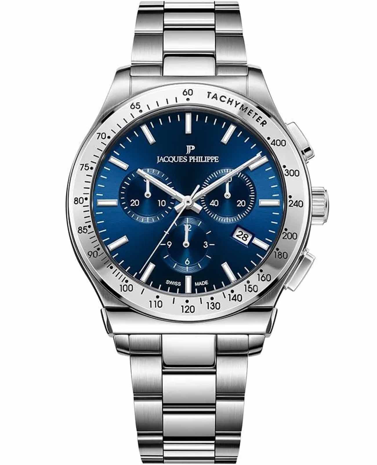 Jacques Philippe JPQGC701336 — швейцарские наручные часы, которые станут идеальным дополнением к образу современного мужчины, ценящего стиль и качество, это стильные швейцарские часы с функцией хронографаХронографФункция позволяет измерять отрезки времени с особой точностью: часы, минуты, секунды. Верным признаком хронографа является наличие на циферблате 3 дополнительных окошек-счётчиков. и секундомераСекундомерСекундоме́р — прибор, способный измерять интервалы времени с точностью до долей секунды.. Корпус и браслет выполнены из высокопрочной нержавеющей стали 316L, что подчеркивает статус владельца и гарантирует долговечность аксессуара. Классический дизайн с синим циферблатом гармонично сочетается с современными деталями: тахиметрическаяТахиметрРазмеченная шкала, располагается на ободке или безеле часов. Тахиметр позволяет рассчитать скорость на определённом участке пути, расстояние измеряется в километрах или милях. шкала на безелеБезельВнешний ободок, закрепляющий стекло. В спортивных часах так называется поворотное кольцо с делениями на циферблате, выполняет роль таймера – замеряет отрезки времени на шкале. Неподвижный безель – элемент декора. Однонаправленно вращающийся безель на дайверских часах позволяет фиксировать моменты погружения и выныривания на поверхность. добавляет функциональности, а окошко даты, расположенное на отметке «4 часа», обеспечивает дополнительное удобство. Сапфировое стеклоСапфировое стеклоПрочный и надёжный материал из кристалла сапфира синтетического происхождения, характеризующийся особой твёрдостью и устойчивостью к царапинам и повреждениям. надежно защищает часы от царапин и повреждений, сохраняя их безупречный внешний вид. Кварцевый механизм обеспечивает точный ход и не требует частого обслуживания. Водозащита до 10 атмосфер (100 метров) позволяет не снимать часы во время плавания. Стрелки имеют люминесцентное покрытиеЛюминесцентное покрытиеПозволяет считывать показания времени в темноте. Производители наносят на стрелки, часовые индексы, безель или поверхность циферблата светонакопительный состав, дающий холодное свечение. для удобства чтения времени в темноте. Стальной браслет шириной 20 мм оснащен застежкой «бабочка»Застёжка "бабочка"Такой вид застёжки дополняется предохранителями, помогающими избежать случайного раскрытия браслета. Обладают изящным исполнением. для комфортного ношения в течение всего дня.