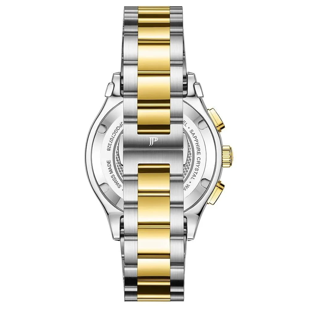 Jacques Philippe JPQGC707328 — швейцарские наручные часы, которые станут идеальным дополнением к образу современного мужчины, ценящего стиль и качество, это стильные швейцарские часы с функцией хронографаХронографФункция позволяет измерять отрезки времени с особой точностью: часы, минуты, секунды. Верным признаком хронографа является наличие на циферблате 3 дополнительных окошек-счётчиков. и секундомераСекундомерСекундоме́р — прибор, способный измерять интервалы времени с точностью до долей секунды.. Корпус и браслет выполнены из высокопрочной нержавеющей стали 316L, что подчеркивает статус владельца и гарантирует долговечность аксессуара. Классический дизайн с белым циферблатом гармонично сочетается с современными деталями: тахиметрическаяТахиметрРазмеченная шкала, располагается на ободке или безеле часов. Тахиметр позволяет рассчитать скорость на определённом участке пути, расстояние измеряется в километрах или милях. шкала на безелеБезельВнешний ободок, закрепляющий стекло. В спортивных часах так называется поворотное кольцо с делениями на циферблате, выполняет роль таймера – замеряет отрезки времени на шкале. Неподвижный безель – элемент декора. Однонаправленно вращающийся безель на дайверских часах позволяет фиксировать моменты погружения и выныривания на поверхность. с золотистым IP-покрытиемIP-покрытиеМетод ионного напыления. Демонстрирует повышенную устойчивость к истиранию, окислению и химическим веществам. Под воздействием высокого давления и температуры около 1500°C молекулы металла надёжно соединяются с частицами корпуса часов. добавляет функциональности, а окошко даты, расположенное на отметке «4 часа», обеспечивает дополнительное удобство. Сапфировое стеклоСапфировое стеклоПрочный и надёжный материал из кристалла сапфира синтетического происхождения, характеризующийся особой твёрдостью и устойчивостью к царапинам и повреждениям. надежно защищает часы от царапин и повреждений, сохраняя их безупречный внешний вид. Кварцевый механизм обеспечивает точный ход и не требует частого обслуживания. Водозащита до 10 атмосфер (100 метров) позволяет не снимать часы во время плавания. Стрелки имеют люминесцентное покрытиеЛюминесцентное покрытиеПозволяет считывать показания времени в темноте. Производители наносят на стрелки, часовые индексы, безель или поверхность циферблата светонакопительный состав, дающий холодное свечение. для удобства чтения времени в темноте. Стальной браслет с частичным золотистым IP-покрытиемIP-покрытиеМетод ионного напыления. Демонстрирует повышенную устойчивость к истиранию, окислению и химическим веществам. Под воздействием высокого давления и температуры около 1500°C молекулы металла надёжно соединяются с частицами корпуса часов. шириной 20 мм оснащен застежкой «бабочка»Застёжка "бабочка"Такой вид застёжки дополняется предохранителями, помогающими избежать случайного раскрытия браслета. Обладают изящным исполнением. для комфортного ношения в течение всего дня.