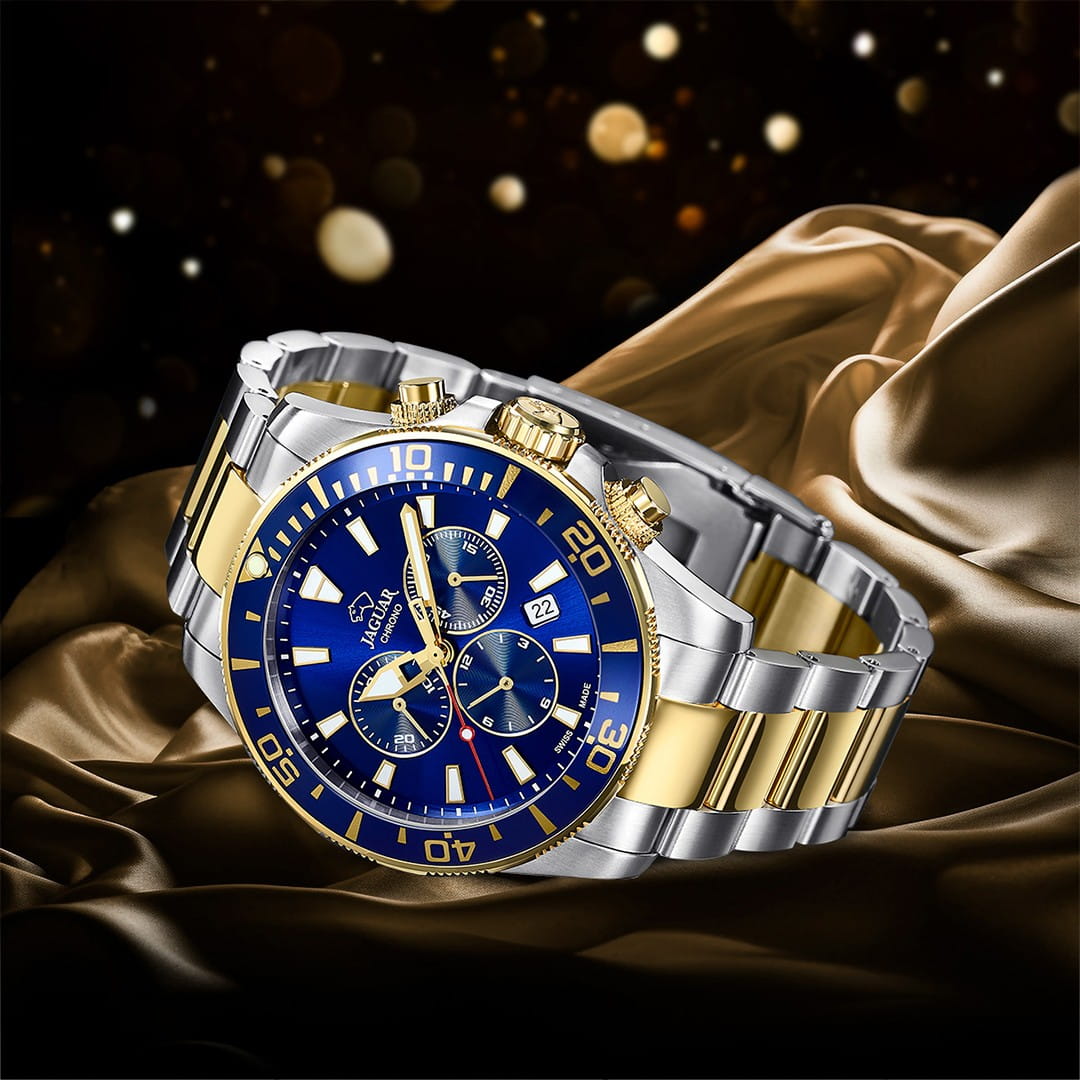 Мужские швейцарские часы Jaguar Automatic Diver J887/1. Автоматический швейцарский калибр ETA 2824-2. Сапфировое стеклоСапфировое стеклоПрочный и надёжный материал из кристалла сапфира синтетического происхождения, характеризующийся особой твёрдостью и устойчивостью к царапинам и повреждениям. устойчивое к мелким механическим повреждениям. Корпус часов изготовлен из нержавеющей стали. Стрелки и метки с люминесцентным покрытиемЛюминесцентное покрытиеПозволяет считывать показания времени в темноте. Производители наносят на стрелки, часовые индексы, безель или поверхность циферблата светонакопительный состав, дающий холодное свечение.. Окошко даты находится в положении 3 часа. Класс водозащиты: 200 метров, позволит плавать, нырять и заниматься другими водными видами спорта. Стальной браслет с частичным PVD-покрытиемPVDУльтратонкое покрытие наносится в технике вакуумного напыления, сочетает в себе нитрид титана особой прочности со слоем золота или оксида хрома. Несёт в себе декоративную или защитную функцию. на раскладной застёжкеРаскладная застёжкаТакой тип застёжки используется только на браслетах из металла. Она никогда не раскрывается полностью, происходит разделение на 2 и более частей. Раскладывающая застёжка снизит вероятность потери часов к минимуму.. БезельБезельВнешний ободок, закрепляющий стекло. В спортивных часах так называется поворотное кольцо с делениями на циферблате, выполняет роль таймера – замеряет отрезки времени на шкале. Неподвижный безель – элемент декора. Однонаправленно вращающийся безель на дайверских часах позволяет фиксировать моменты погружения и выныривания на поверхность. с PVD-покрытиемPVDУльтратонкое покрытие наносится в технике вакуумного напыления, сочетает в себе нитрид титана особой прочности со слоем золота или оксида хрома. Несёт в себе декоративную или защитную функцию..