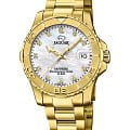 Женские швейцарские часы Jaguar Couple Diver J898/1. Кварцевый швейцарский калибр Ronda 705. Сапфировое стеклоСапфировое стеклоПрочный и надёжный материал из кристалла сапфира синтетического происхождения, характеризующийся особой твёрдостью и устойчивостью к царапинам и повреждениям. устойчивое к мелким механическим повреждениям. Корпус часов изготовлен из нержавеющей стали с PVD-покрытиемPVDУльтратонкое покрытие наносится в технике вакуумного напыления, сочетает в себе нитрид титана особой прочности со слоем золота или оксида хрома. Несёт в себе декоративную или защитную функцию.. Стрелки и метки с люминесцентным покрытиемЛюминесцентное покрытиеПозволяет считывать показания времени в темноте. Производители наносят на стрелки, часовые индексы, безель или поверхность циферблата светонакопительный состав, дающий холодное свечение.. Окошко даты находится в положении 3 часа. Класс водозащиты: 200 метров, позволит плавать, нырять и заниматься другими водными видами спорта. Стальной браслет с PVD-покрытиемPVDУльтратонкое покрытие наносится в технике вакуумного напыления, сочетает в себе нитрид титана особой прочности со слоем золота или оксида хрома. Несёт в себе декоративную или защитную функцию. на раскладной застёжкеРаскладная застёжкаТакой тип застёжки используется только на браслетах из металла. Она никогда не раскрывается полностью, происходит разделение на 2 и более частей. Раскладывающая застёжка снизит вероятность потери часов к минимуму.. Циферблат украшен кристаллами в роли часовых индексов. БезельБезельВнешний ободок, закрепляющий стекло. В спортивных часах так называется поворотное кольцо с делениями на циферблате, выполняет роль таймера – замеряет отрезки времени на шкале. Неподвижный безель – элемент декора. Однонаправленно вращающийся безель на дайверских часах позволяет фиксировать моменты погружения и выныривания на поверхность. с PVD-покрытиемPVDУльтратонкое покрытие наносится в технике вакуумного напыления, сочетает в себе нитрид титана особой прочности со слоем золота или оксида хрома. Несёт в себе декоративную или защитную функцию..