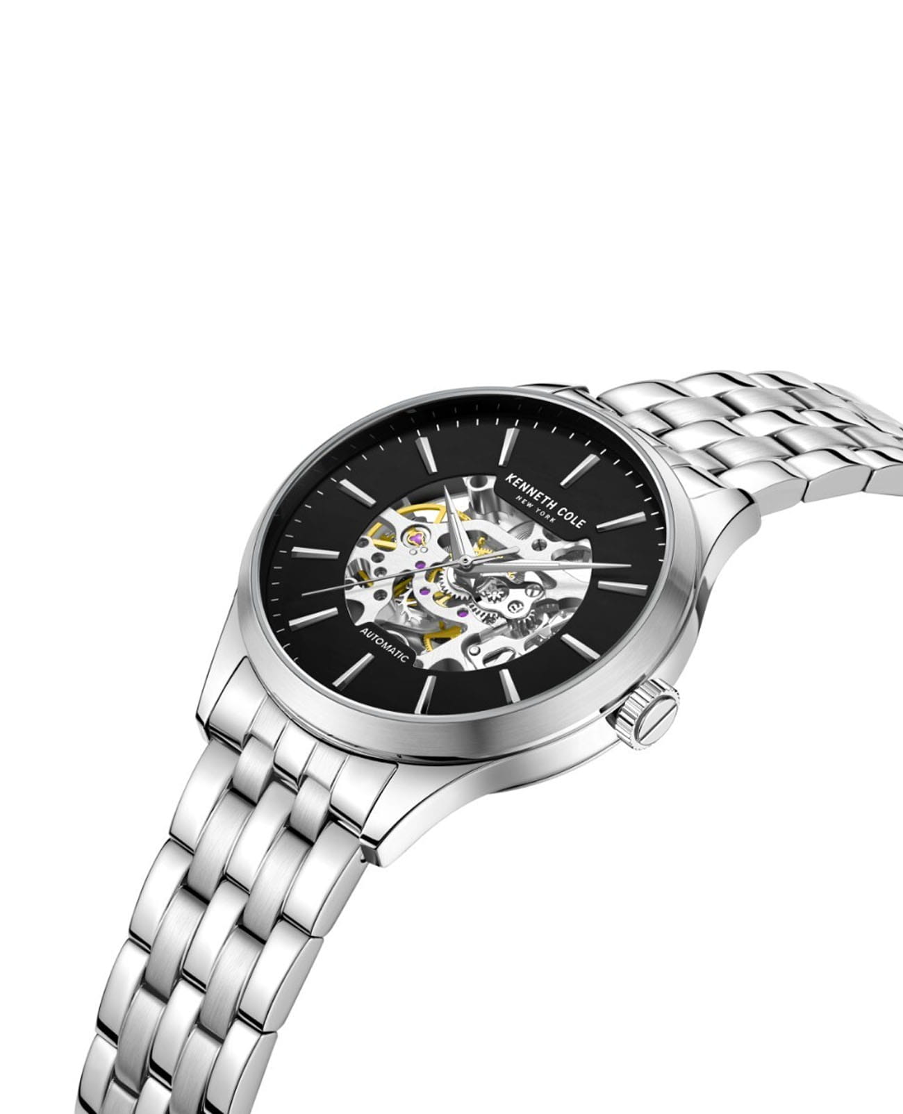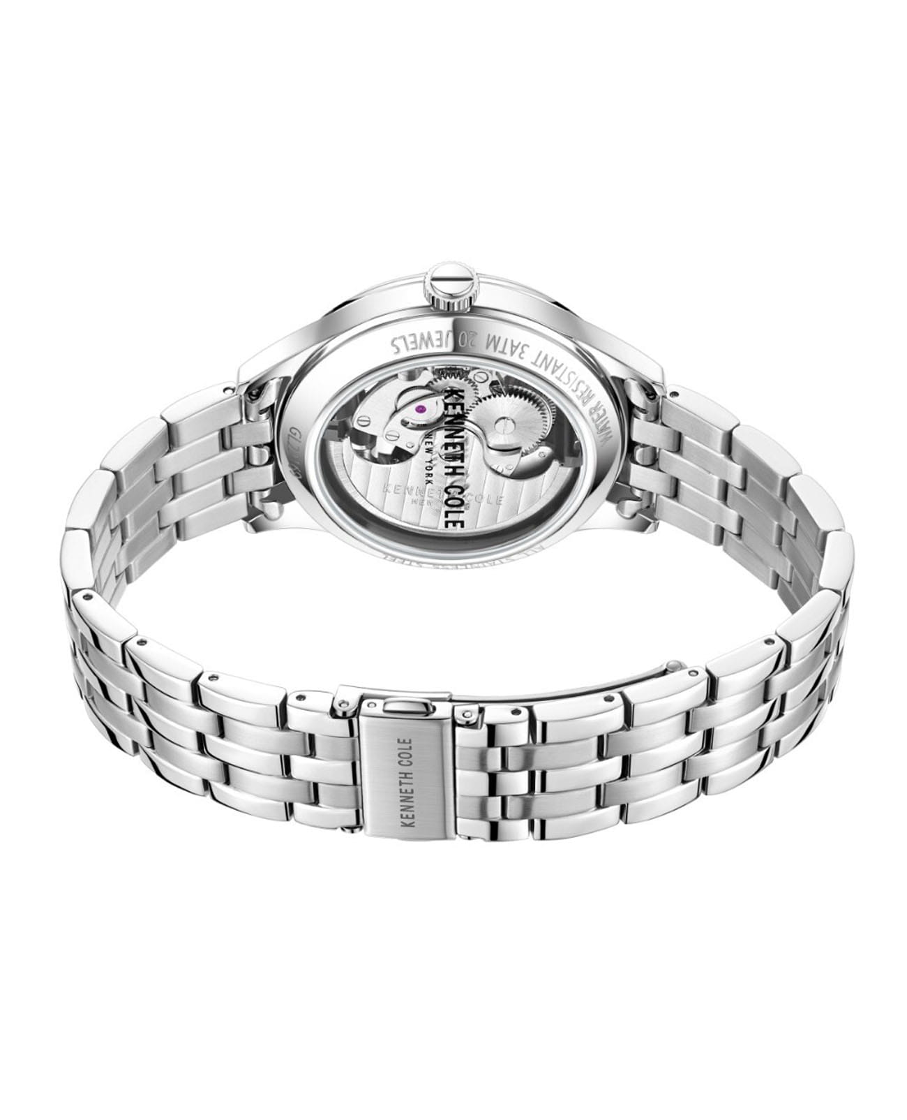 Мужские механические часы-скелетоны с минеральным стекломМинеральное стеклоМинеральное стекло представляет собой искусственно выращенный минерал кварца. Такое стекло отличается особой устойчивостью к повреждениям и царапинам. Уступает по некоторым качествам сапфировому стеклу. Kenneth Cole Automatic KCWGL2216907, механический механизм (автоматический калибр) с высокой точностью. Корпус часов изготовлен из стали. Стрелки с люминесцентным покрытиемЛюминесцентное покрытиеПозволяет считывать показания времени в темноте. Производители наносят на стрелки, часовые индексы, безель или поверхность циферблата светонакопительный состав, дающий холодное свечение.. Класс водозащиты: 30 метров, позволит защитить корпус от случайных брызг или капель дождя. Стальной браслет на раскладной застёжкеРаскладная застёжкаТакой тип застёжки используется только на браслетах из металла. Она никогда не раскрывается полностью, происходит разделение на 2 и более частей. Раскладывающая застёжка снизит вероятность потери часов к минимуму..