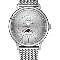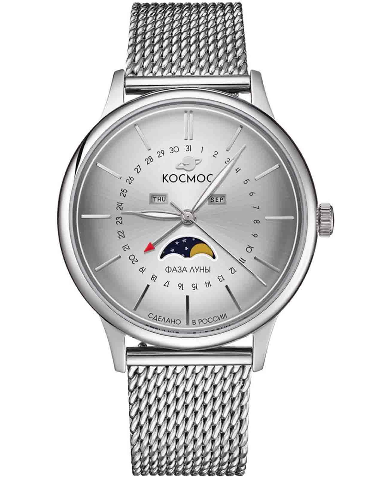 Российские мужские кварцевые часы Космос K 067.10.33 из коллекции Сатурн оснащены механизмом Miyota. Круглый корпус из нержавеющей стали 316L диаметром 41 мм и толщиной 13 мм защищен минеральным стекломМинеральное стеклоМинеральное стекло представляет собой искусственно выращенный минерал кварца. Такое стекло отличается особой устойчивостью к повреждениям и царапинам. Уступает по некоторым качествам сапфировому стеклу.. Серебристый циферблат с серыми элементами и градиентной шлифовкой в стиле солнечных лучей украшен изготовленными вручную индексами, крепящимися на двух штифтах. Часы имеют функции отображения даты центральной стрелкой, дня недели и индикатора фаз луны. Часовая, минутная стрелки, круг по краю циферблата и линия вокруг окошка индикатора фаз луны имеют люминесцентное покрытиеЛюминесцентное покрытиеПозволяет считывать показания времени в темноте. Производители наносят на стрелки, часовые индексы, безель или поверхность циферблата светонакопительный состав, дающий холодное свечение., которое светится в темноте, создавая эффект ореола вокруг Земли. На задней крышке выгравирован фантазийный сюжет — космическая станция будущего. Полированный корпус часов напоминает силуэт летающей тарелки благодаря выпуклым формам стекла и нижней части корпуса. Часы имеют водонепроницаемость 50 метров, позволит защитить корпус от случайных брызг или капель дождя. Модель комплектуется стальным браслетом миланского плетения на раскладном замкеРаскладной замокДанный вариант застежки используется только на часах с металлическим браслетом. Отличительная особенность такого крепления в том, что длина браслета становится универсальной и вы можете самостоятельно отрегулировать нужный вам размер – застежка просто двигается по браслету часов.. Эти часы сочетают в себе классический дизайн, современные технологии и футуристическое вдохновение, делая их идеальным выбором для ценителей точности и элегантности.