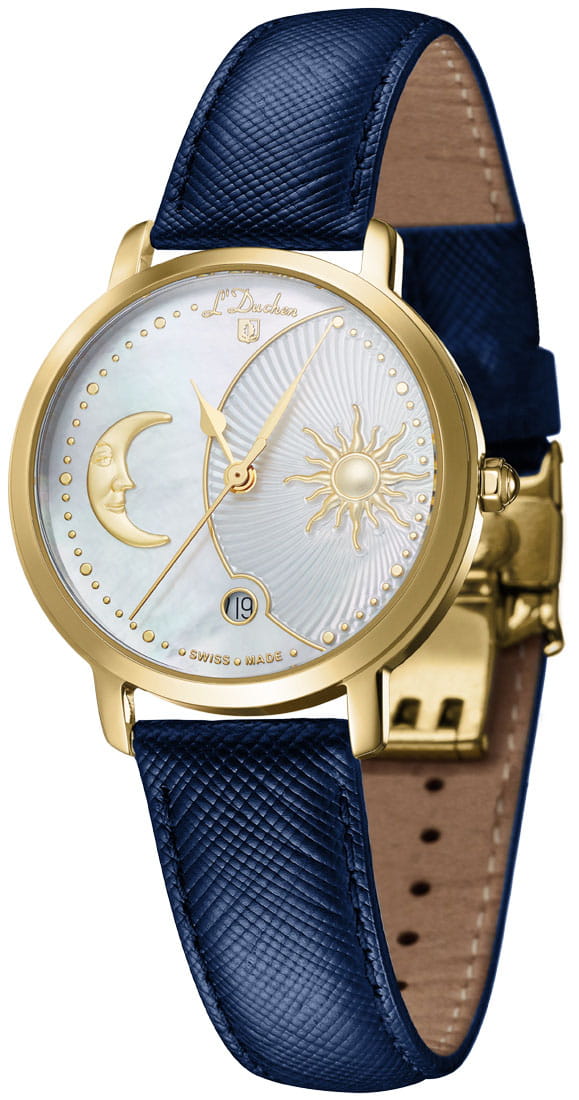 Женские кварцевые часы L'Duchen из коллекции Day & Night — это изысканный аксессуар, вдохновлённый сменой времени суток. Корпус диаметром 34 мм выполнен из нержавеющей стали с PVD-покрытиемPVDУльтратонкое покрытие наносится в технике вакуумного напыления, сочетает в себе нитрид титана особой прочности со слоем золота или оксида хрома. Несёт в себе декоративную или защитную функцию. жёлтого золота. Циферблат белого цвета изготовлен из натурального перламутра и условно разделён на две части: одна символизирует день с объёмным солнцем и декором в виде гильоше, другая — ночь с объёмным изображением луны. Окошко даты расположено в положении 6 часов. Циферблат защищён сапфировым стекломСапфировое стеклоПрочный и надёжный материал из кристалла сапфира синтетического происхождения, характеризующийся особой твёрдостью и устойчивостью к царапинам и повреждениям.. Часы оснащены ремешком из натуральной кожи синего цвета с сафьяновым тиснением и застёжкой «бабочка» с кнопкамиЗастёжка "бабочка"Такой вид застёжки дополняется предохранителями, помогающими избежать случайного раскрытия браслета. Обладают изящным исполнением. , украшенной логотипом бренда — дубовым листом, символом мудрости и долговечности. Заводная головка — восьмигранной формы. Водонепроницаемость 50 м позволяет использовать часы в повседневных условиях.