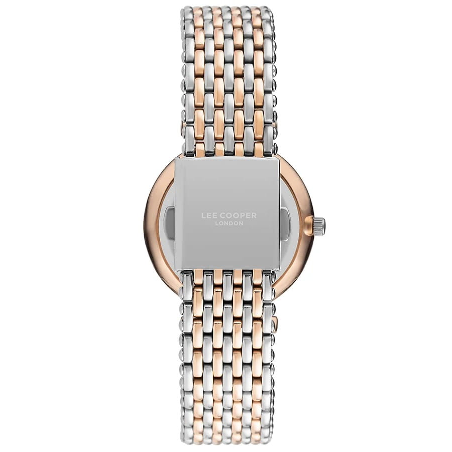 Женские наручные часы Lee Cooper LC07410.520 — это элегантная модель с утончённым дизайном. Корпус диаметром 33 мм выполнен из нержавеющей стали с IP-покрытиемIP-покрытиеМетод ионного напыления. Демонстрирует повышенную устойчивость к истиранию, окислению и химическим веществам. Под воздействием высокого давления и температуры около 1500°C молекулы металла надёжно соединяются с частицами корпуса часов., что придаёт часам изысканный вид. Перламутровый циферблат украшен изящными метками из кристаллов и стрелками, обеспечивая удобное считывание времени. Циферблат защищён минеральным стекломМинеральное стеклоМинеральное стекло представляет собой искусственно выращенный минерал кварца. Такое стекло отличается особой устойчивостью к повреждениям и царапинам. Уступает по некоторым качествам сапфировому стеклу., устойчивым к царапинам. Часы работают на кварцевом механизме, обеспечивая точность хода. Браслет из нержавеющей стали с раскладной застёжкойРаскладная застёжкаТакой тип застёжки используется только на браслетах из металла. Она никогда не раскрывается полностью, происходит разделение на 2 и более частей. Раскладывающая застёжка снизит вероятность потери часов к минимуму. гарантирует комфортное ношение и надёжную фиксацию на запястье. Водозащита 30 метров защищает часы от случайных брызг и дождя, делая их подходящими для повседневного использования.