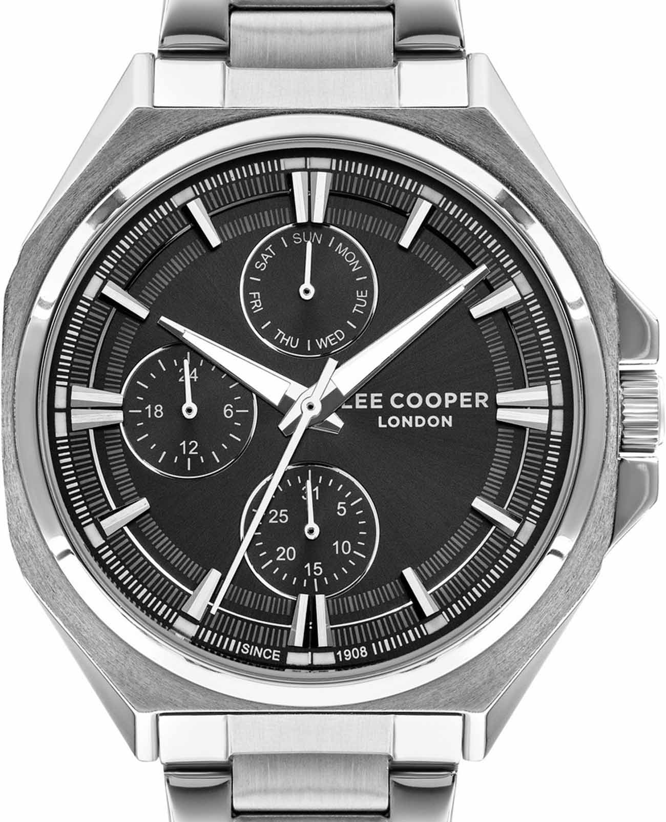 Мужские часы Lee Cooper LC07716.350 выполнены в классическом стиле и сочетают строгий дизайн с широким функционалом. Модель оснащена кварцевым механизмом , обеспечивающим точность хода и минимальное обслуживание. Корпус размером 44 мм изготовлен из суперметалла. Браслет выполнен из нержавеющей стали серебристого цвета и оснащён раскладной застёжкойРаскладная застёжкаТакой тип застёжки используется только на браслетах из металла. Она никогда не раскрывается полностью, происходит разделение на 2 и более частей. Раскладывающая застёжка снизит вероятность потери часов к минимуму. для комфортного ношения. Циферблат чёрного цвета дополнен индексами, а также функциями отображения даты , дня недели и 24-часового индикатора времени , что делает модель особенно удобной в повседневной носке. Защиту циферблата обеспечивает минеральное стекло минеральное стеклоМинеральное стеклоМинеральное стекло представляет собой искусственно выращенный минерал кварца. Такое стекло отличается особой устойчивостью к повреждениям и царапинам. Уступает по некоторым качествам сапфировому стеклу., устойчивое к мелким механическим повреждениям. Водозащита 5 АТМ позволяет использовать часы в условиях случайного контакта с водой — например, при мытье рук или под дождём. Это идеальный выбор для тех, кто ценит классический стиль, надёжность и расширенный функционал в одном аксессуаре.