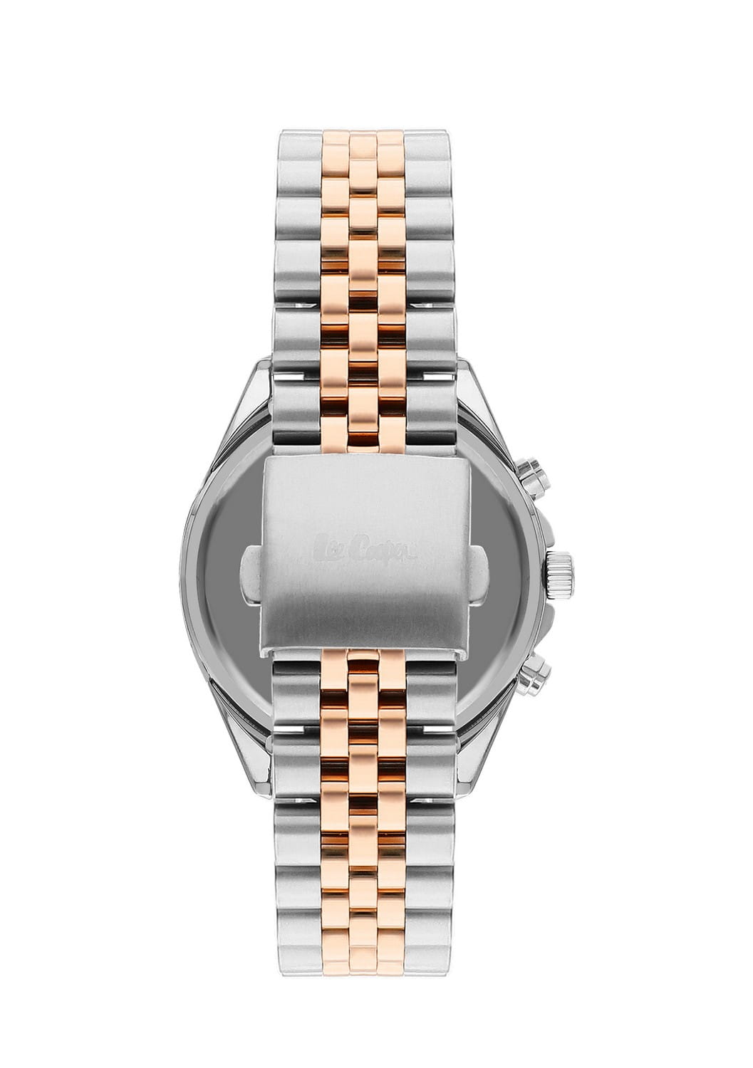 Мужские часы Lee Cooper LC07838.560 — это стильное сочетание элегантности и современного дизайна. Корпус диаметром 45 мм выполнен из суперметалла серебристого цвета, придающий модели особый блеск. Изысканный циферблат защищен минеральным стекломМинеральное стеклоМинеральное стекло представляет собой искусственно выращенный минерал кварца. Такое стекло отличается особой устойчивостью к повреждениям и царапинам. Уступает по некоторым качествам сапфировому стеклу., обеспечивающим устойчивость к царапинам. Метки в виде штрихов. Вынесенный циферблат с 24-х часовым указателем времени и с хронографомХронографФункция позволяет измерять отрезки времени с особой точностью: часы, минуты, секунды. Верным признаком хронографа является наличие на циферблате 3 дополнительных окошек-счётчиков.. Стрелки и метки с люминесцентным покрытиемЛюминесцентное покрытиеПозволяет считывать показания времени в темноте. Производители наносят на стрелки, часовые индексы, безель или поверхность циферблата светонакопительный состав, дающий холодное свечение. позволяют легко считывать время даже в условиях недостаточного освещения.Часы оснащены надежным кварцевым механизмом, а стальной браслет с частичным IP-покрытиемIP-покрытиеМетод ионного напыления. Демонстрирует повышенную устойчивость к истиранию, окислению и химическим веществам. Под воздействием высокого давления и температуры около 1500°C молекулы металла надёжно соединяются с частицами корпуса часов. на раскладной застёжкеРаскладная застёжкаТакой тип застёжки используется только на браслетах из металла. Она никогда не раскрывается полностью, происходит разделение на 2 и более частей. Раскладывающая застёжка снизит вероятность потери часов к минимуму. гарантирует комфортную посадку на запястье. Водозащита 50 метров защищает модель от случайных брызг и дождя. Lee Cooper  — отличный выбор для тех, кто ценит утонченность и качество.