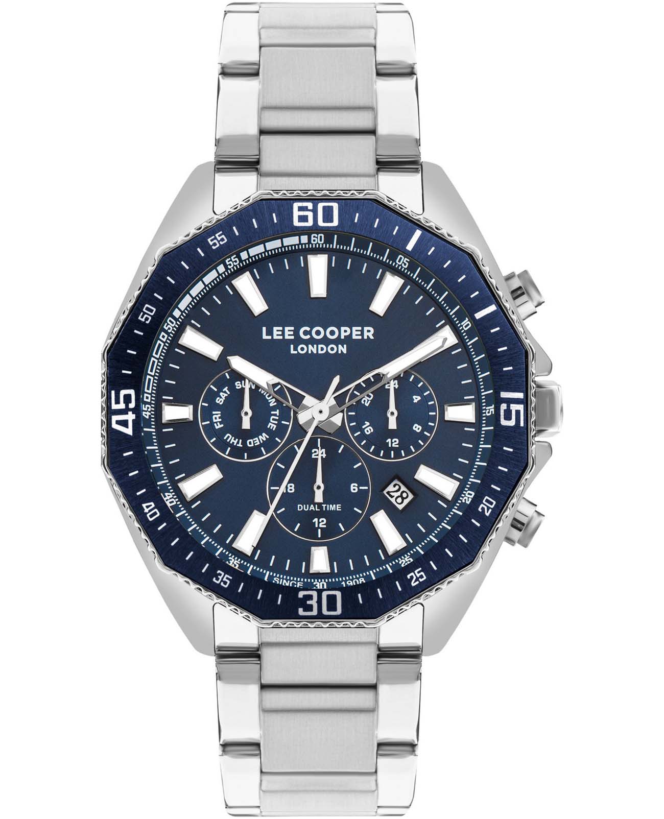 Мужские часы Lee Cooper LC07847.390 выполнены в классическом стиле и сочетают строгий дизайн с надёжным механизмом. Модель оснащена кварцевым механизмом , обеспечивающим точность хода и минимальное обслуживание. Корпус имеет размер 45 мм , изготовлен из металла. Циферблат синего цвета дополнен индексами для чёткого отсчёта времени, а также функциями отображения даты , дня недели , 24-часового индикатора и второго часового пояса второй часовой поясВторой часовой поясФункция, позволяющая отображать время двух часовых поясов одновременно.. Защиту циферблата обеспечивает минеральное стекло минеральное стеклоМинеральное стеклоМинеральное стекло представляет собой искусственно выращенный минерал кварца. Такое стекло отличается особой устойчивостью к повреждениям и царапинам. Уступает по некоторым качествам сапфировому стеклу., устойчивое к мелким механическим повреждениям. Водозащита 5 АТМ позволяет использовать часы в повседневных условиях без риска повреждения от случайных брызг воды. Это сочетание классического дизайна, прочности материалов и качества исполнения для уверенных в себе мужчин.