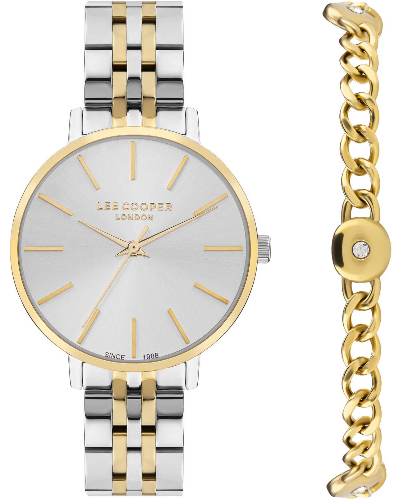 Женские часы Lee Cooper LC07857.230 — это стильное сочетание элегантности и современного дизайна. Изящный круглый корпус диаметром 34 мм выполнен из суперметалла с безелемБезельВнешний ободок, закрепляющий стекло. В спортивных часах так называется поворотное кольцо с делениями на циферблате, выполняет роль таймера – замеряет отрезки времени на шкале. Неподвижный безель – элемент декора. Однонаправленно вращающийся безель на дайверских часах позволяет фиксировать моменты погружения и выныривания на поверхность. с IP-покрытиемIP-покрытиеМетод ионного напыления. Демонстрирует повышенную устойчивость к истиранию, окислению и химическим веществам. Под воздействием высокого давления и температуры около 1500°C молекулы металла надёжно соединяются с частицами корпуса часов. золотого цвета, что придает модели особый блеск. Серебристый циферблат защищен минеральным стекломМинеральное стеклоМинеральное стекло представляет собой искусственно выращенный минерал кварца. Такое стекло отличается особой устойчивостью к повреждениям и царапинам. Уступает по некоторым качествам сапфировому стеклу., обеспечивающим устойчивость к царапинам. Метки в виде штрихов. Часы оснащены надежным кварцевым механизмом, а стальной браслет с частичным IP-покрытиемIP-покрытиеМетод ионного напыления. Демонстрирует повышенную устойчивость к истиранию, окислению и химическим веществам. Под воздействием высокого давления и температуры около 1500°C молекулы металла надёжно соединяются с частицами корпуса часов. на раскладной застёжкеРаскладная застёжкаТакой тип застёжки используется только на браслетах из металла. Она никогда не раскрывается полностью, происходит разделение на 2 и более частей. Раскладывающая застёжка снизит вероятность потери часов к минимуму. гарантирует комфортную посадку на запястье. Водозащита 30 метров защищает модель от случайных брызг и дождя. В комплекте к часам идет дополнительный браслет. Lee Cooper — отличный выбор для тех, кто ценит утонченность и качество.