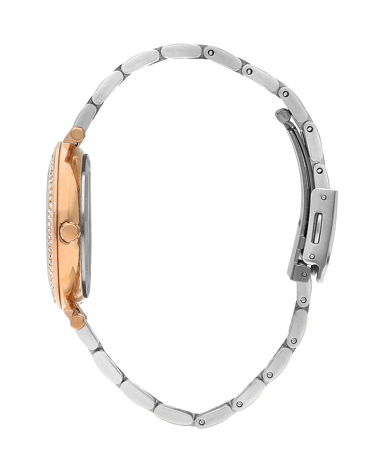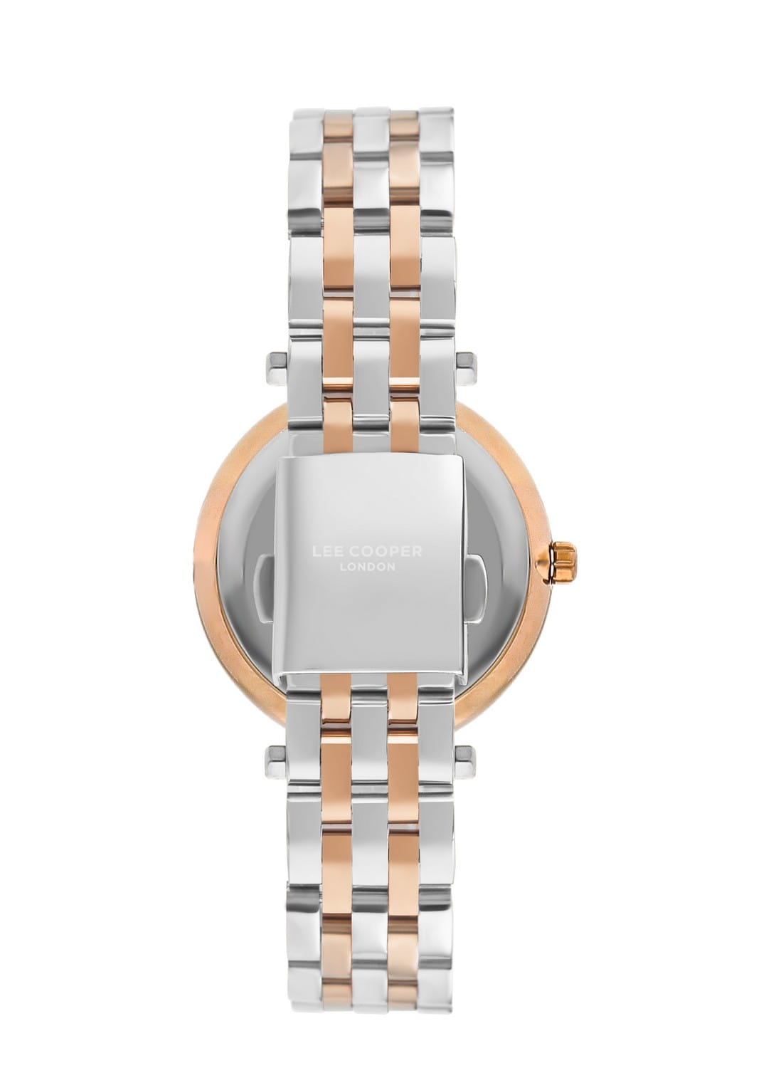 Женские часы Lee Cooper LC07864.530 — это стильное сочетание элегантности и современного дизайна. Круглый корпус диаметром 34 мм выполнен из суперметалла с IP-покрытиемIP-покрытиеМетод ионного напыления. Демонстрирует повышенную устойчивость к истиранию, окислению и химическим веществам. Под воздействием высокого давления и температуры около 1500°C молекулы металла надёжно соединяются с частицами корпуса часов., а неподвижный безельБезельВнешний ободок, закрепляющий стекло. В спортивных часах так называется поворотное кольцо с делениями на циферблате, выполняет роль таймера – замеряет отрезки времени на шкале. Неподвижный безель – элемент декора. Однонаправленно вращающийся безель на дайверских часах позволяет фиксировать моменты погружения и выныривания на поверхность. инкрустирован 140 фианитами, придающими модели особый блеск. Серебристый циферблат защищен минеральным стекломМинеральное стеклоМинеральное стекло представляет собой искусственно выращенный минерал кварца. Такое стекло отличается особой устойчивостью к повреждениям и царапинам. Уступает по некоторым качествам сапфировому стеклу., обеспечивающим устойчивость к царапинам. Метки в виде штрихов. Часы оснащены надежным кварцевым механизмом, а стальной браслет с частичным IP-покрытиемIP-покрытиеМетод ионного напыления. Демонстрирует повышенную устойчивость к истиранию, окислению и химическим веществам. Под воздействием высокого давления и температуры около 1500°C молекулы металла надёжно соединяются с частицами корпуса часов. на раскладной застёжкеРаскладная застёжкаТакой тип застёжки используется только на браслетах из металла. Она никогда не раскрывается полностью, происходит разделение на 2 и более частей. Раскладывающая застёжка снизит вероятность потери часов к минимуму. гарантирует комфортную посадку на запястье. Водозащита 30 метров защищает модель от случайных брызг и дождя. Lee Cooper  — отличный выбор для тех, кто ценит утонченность и качество.