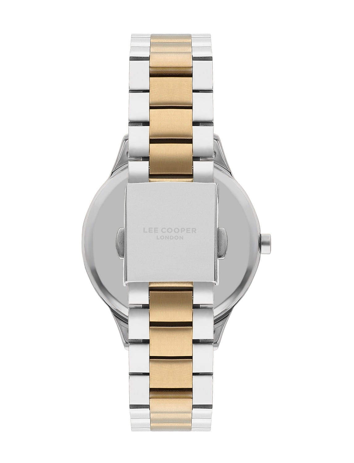 Женские часы Lee Cooper LC07865.230 — это стильное сочетание элегантности и современного дизайна. Круглый корпус диаметром 38 мм выполнен из суперметалла с безелемБезельВнешний ободок, закрепляющий стекло. В спортивных часах так называется поворотное кольцо с делениями на циферблате, выполняет роль таймера – замеряет отрезки времени на шкале. Неподвижный безель – элемент декора. Однонаправленно вращающийся безель на дайверских часах позволяет фиксировать моменты погружения и выныривания на поверхность. с IP-покрытиемIP-покрытиеМетод ионного напыления. Демонстрирует повышенную устойчивость к истиранию, окислению и химическим веществам. Под воздействием высокого давления и температуры около 1500°C молекулы металла надёжно соединяются с частицами корпуса часов. золотого цвета, придающий модели особый блеск. Серебристый циферблат защищен минеральным стекломМинеральное стеклоМинеральное стекло представляет собой искусственно выращенный минерал кварца. Такое стекло отличается особой устойчивостью к повреждениям и царапинам. Уступает по некоторым качествам сапфировому стеклу., обеспечивающим устойчивость к царапинам. Часы оснащены надежным кварцевым механизмом, а стальной браслет с частичным IP-покрытиемIP-покрытиеМетод ионного напыления. Демонстрирует повышенную устойчивость к истиранию, окислению и химическим веществам. Под воздействием высокого давления и температуры около 1500°C молекулы металла надёжно соединяются с частицами корпуса часов. на раскладной застёжкеРаскладная застёжкаТакой тип застёжки используется только на браслетах из металла. Она никогда не раскрывается полностью, происходит разделение на 2 и более частей. Раскладывающая застёжка снизит вероятность потери часов к минимуму. гарантирует комфортную посадку на запястье. Мультифункциональная модель с индикацией даты, дня недели, с дополнительным 24-х часовым индикатором. Водозащита 30 метров защищает модель от случайных брызг и дождя. Lee Cooper — отличный выбор для тех, кто ценит утонченность и качество.